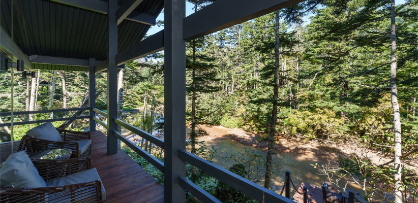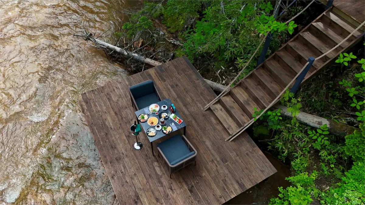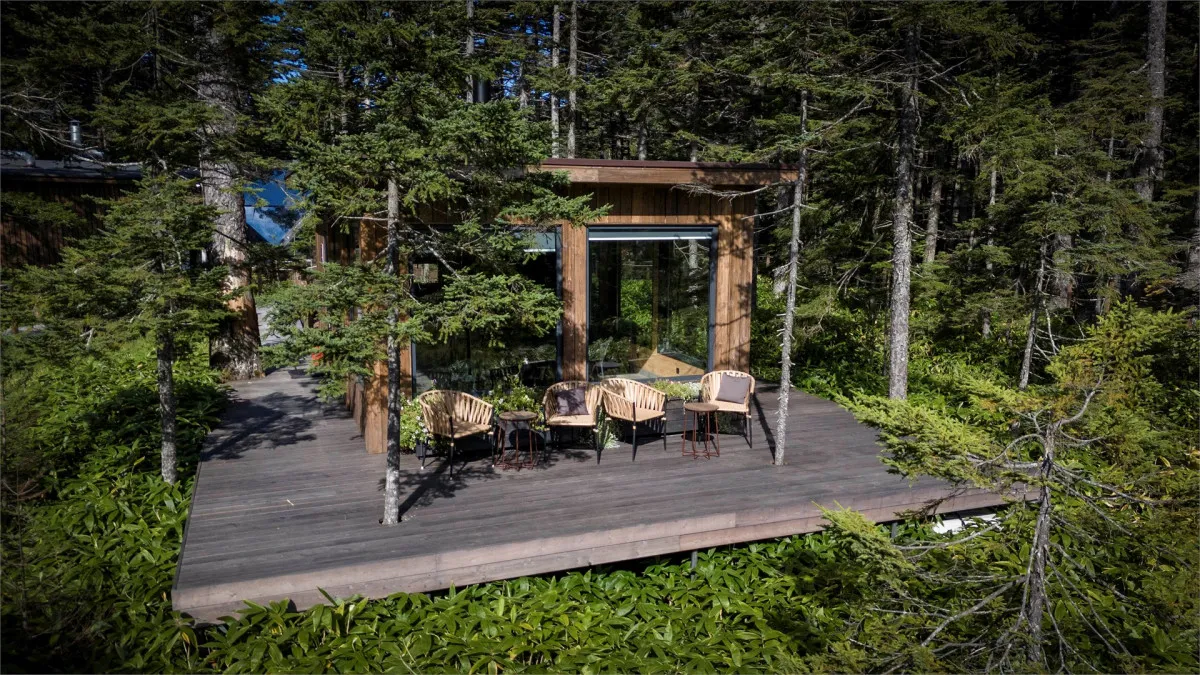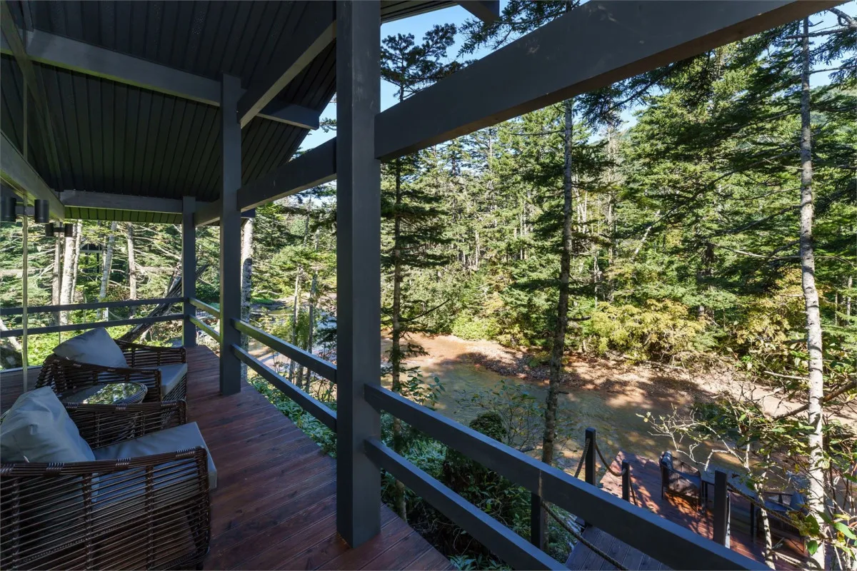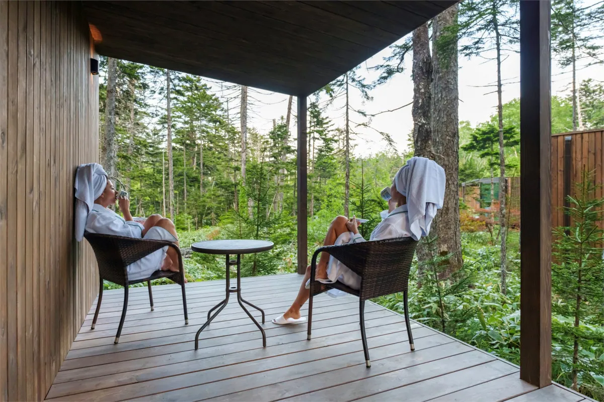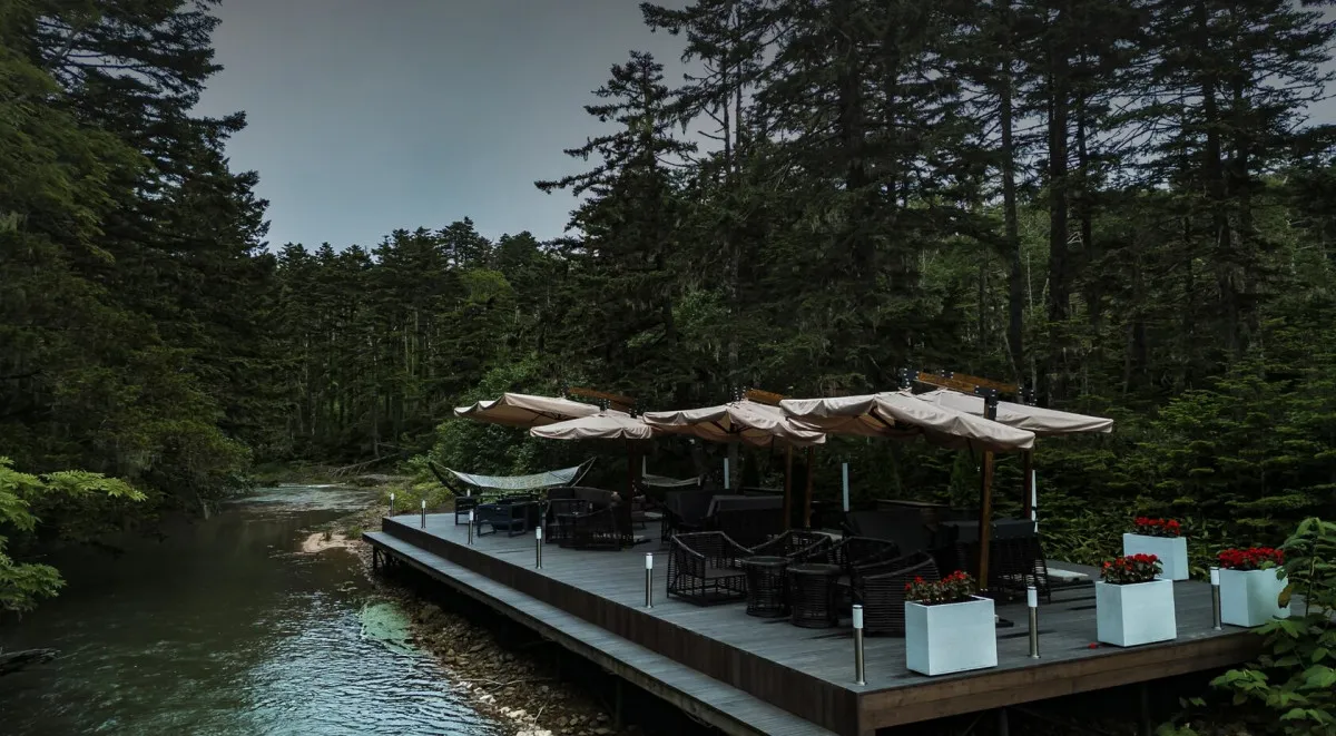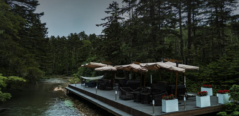 Территория комплекса дополнена уютной террасой у ручья с камином, где создается особая атмосфера тишины и отдыха среди дикой природы Курильских островов.