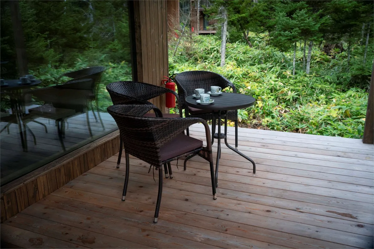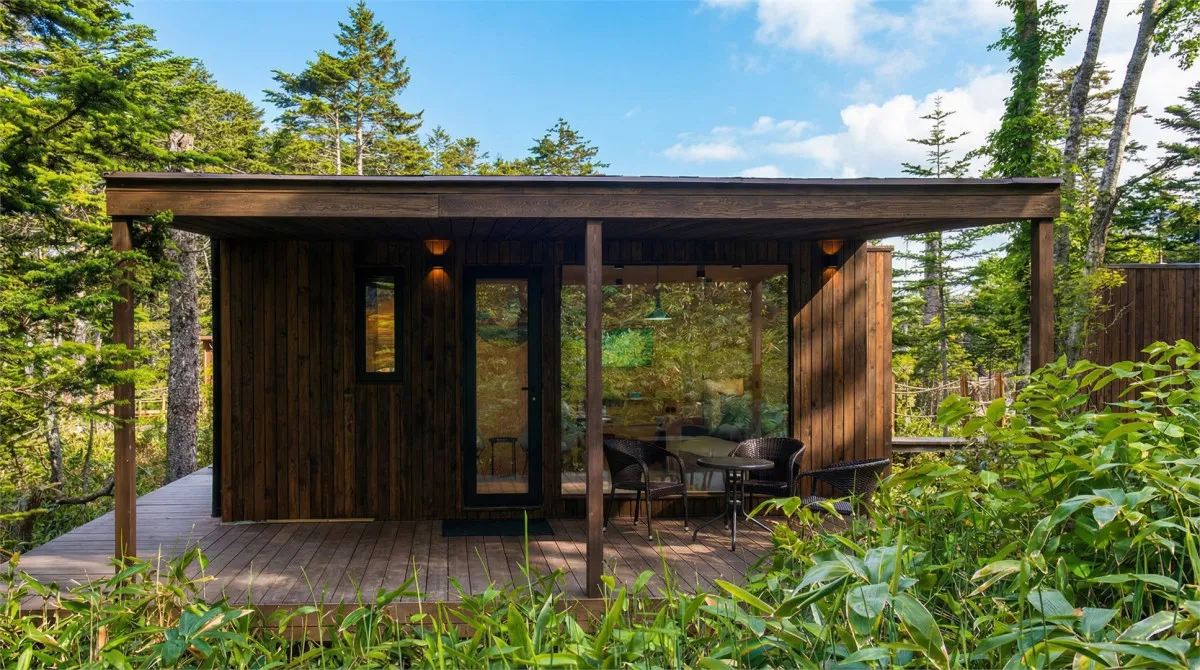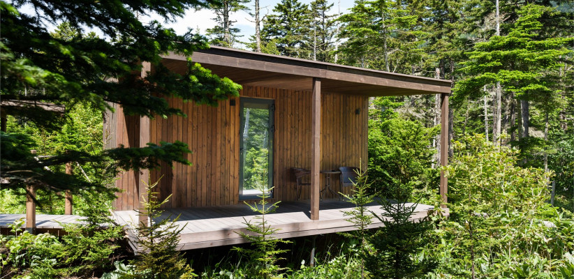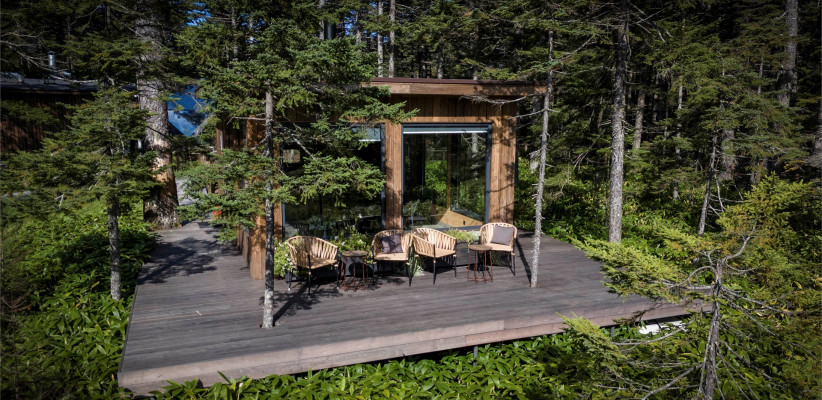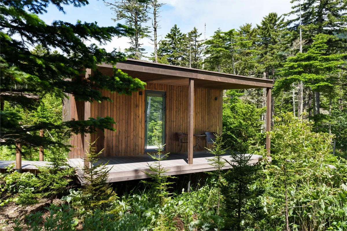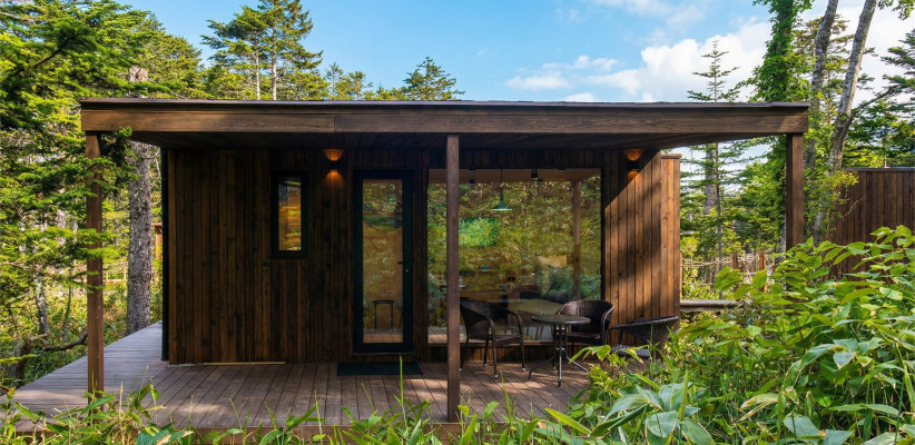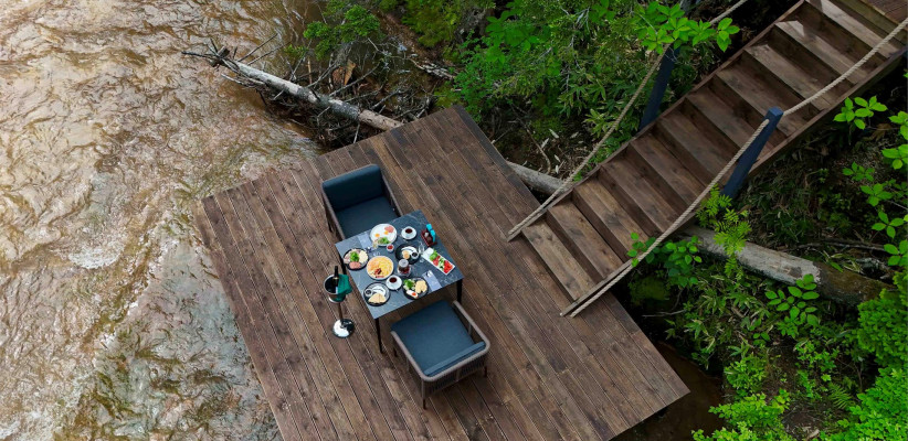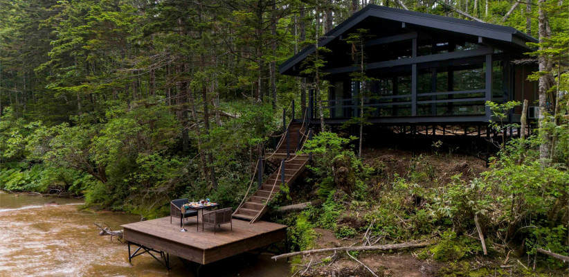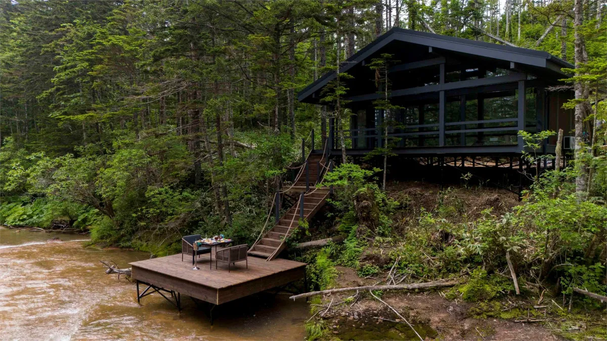 Территория комплекса дополнена уютной террасой у ручья с камином, где создается особая атмосфера тишины и отдыха среди дикой природы Курильских островов.