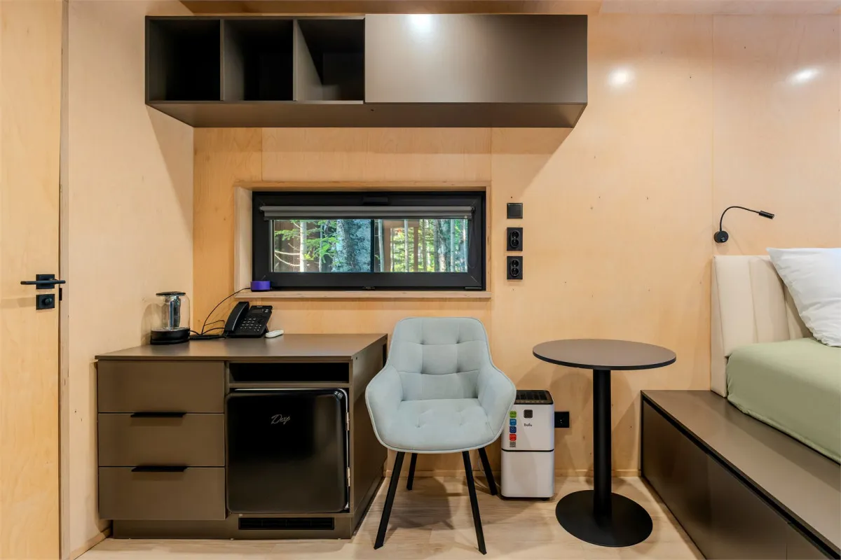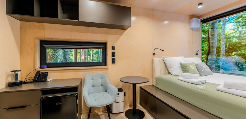 15 м2, двуспальная кровать или две односпальные кровати, меблированная терраса, панорамный вид на лес. Количество гостей: 2Комфорт
