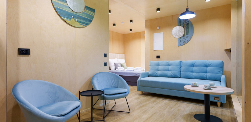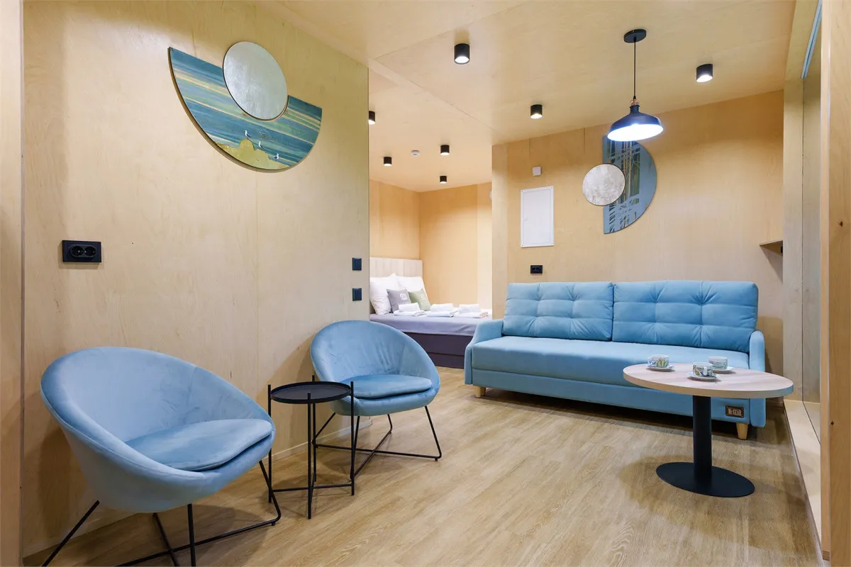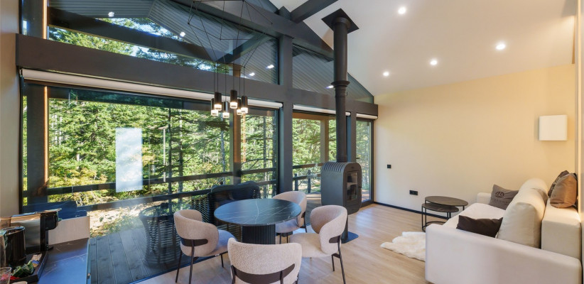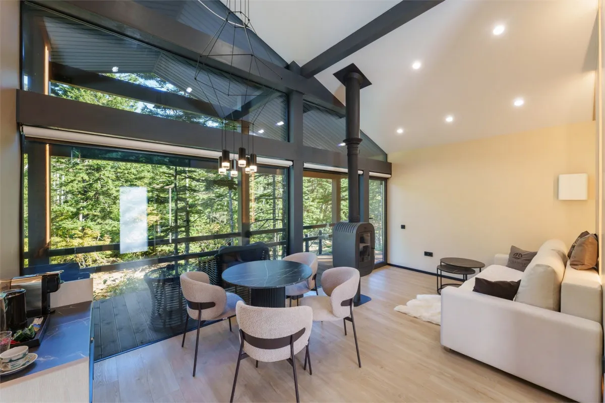 45 м2, двуспальная кровать, отдельная гостиная с диваном-кроватью, две меблированных террасы, панорамный вид на лес. Количество гостей: 4