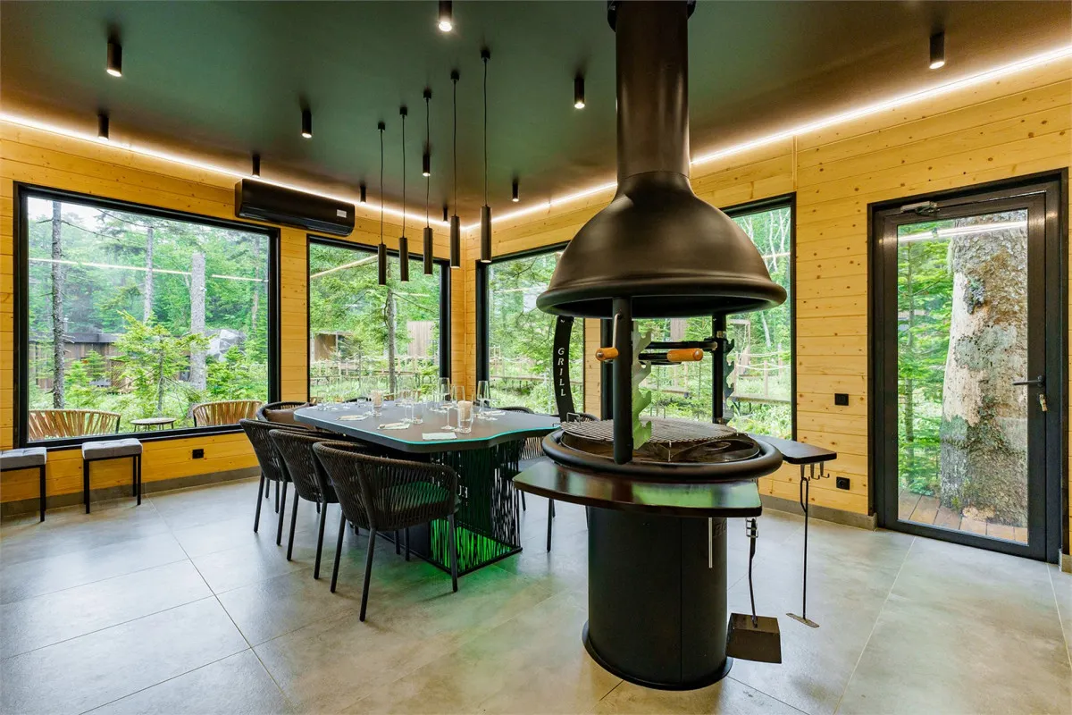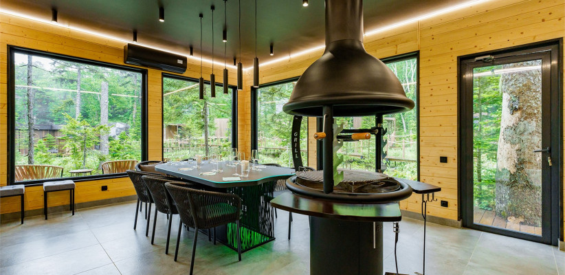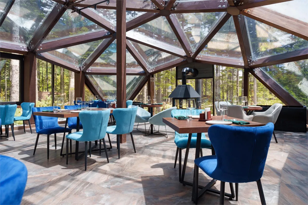На территории работает ресторан «Айны», специализирующийся на авторской кухне Курильских островов. Меню основано на локальных ингредиентах: свежей рыбе, морском гребешке, дикорастущих травах и ягодах. Панорамные виды на хвойный лес и интерьер в эко-стиле создают атмосферу гастрономического путешествия.