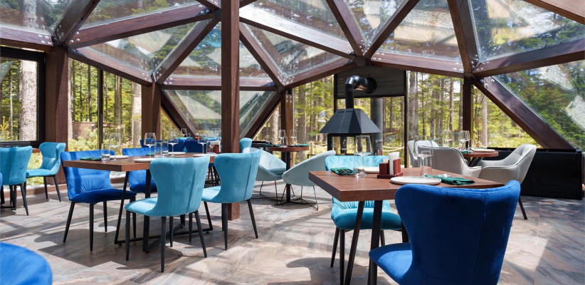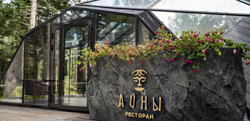 Ресторан «Айны» предлагает авторскую кухню Курильских островов с блюдами из свежих морепродуктов, дикорастущих трав и локальных ингредиентов, в эко-интерьере с панорамным видом на хвойный лес и гастрономическими ужинами