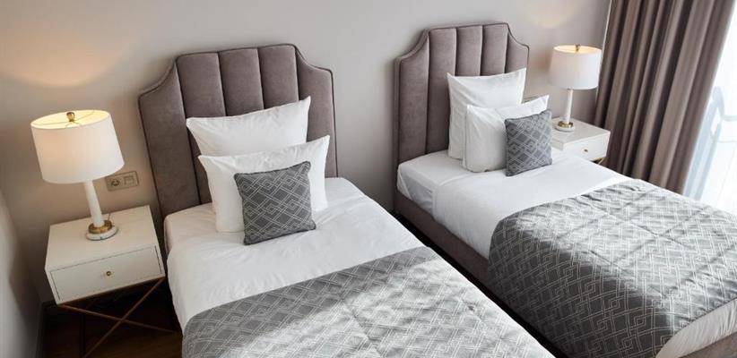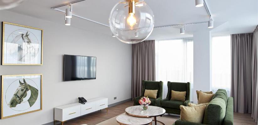 Люкс премьер с двумя раздельными кроватями площадью 72 кв.м., уютный номер с отдельной спальной комнатой и просторной гостиной, двумя односпальными кроватями и диваном, максимальное размещение 2 чел.