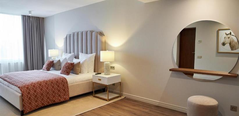Двухкомнатный люкс площадью 56 кв.м., номер с отдельной спальной комнатой и гостиной, двуспальной кроватью и диваном, максимальное размещение 2 чел.
