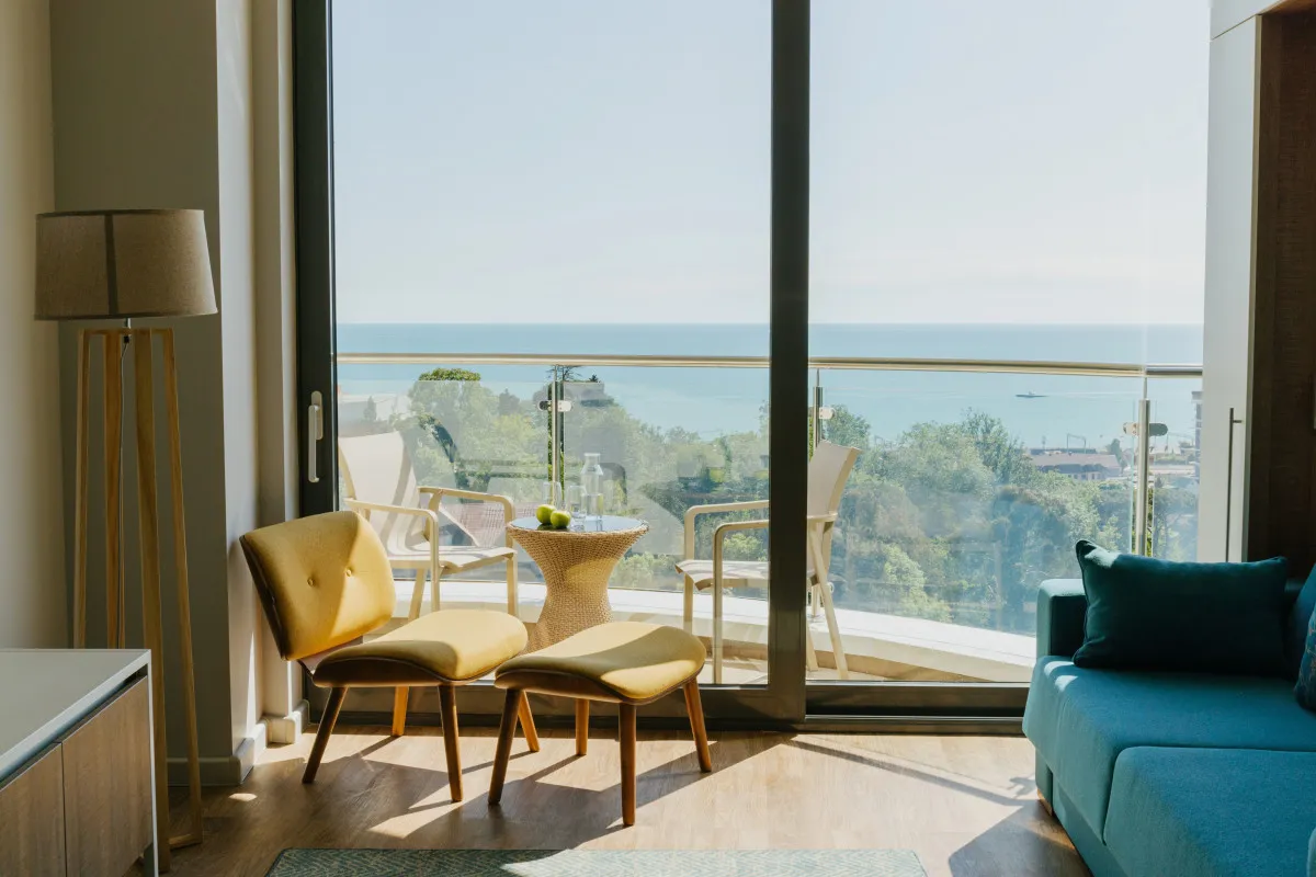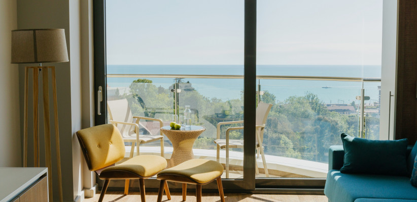 Фонд апартаментов представлен категориями с видами на море, горы или вечнозеленый парк. Доступны различные форматы проживания — от классического отдыха до санаторно-курортных программ. Питание предлагается по выбору: завтраки, полупансион или проживание без питания.