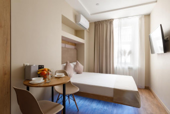 Стандартный двухместный – номер площадью 18 кв. м., максимальное размещение 2 взрослых + 1 ребенок, в спальне двуспальная кровать.