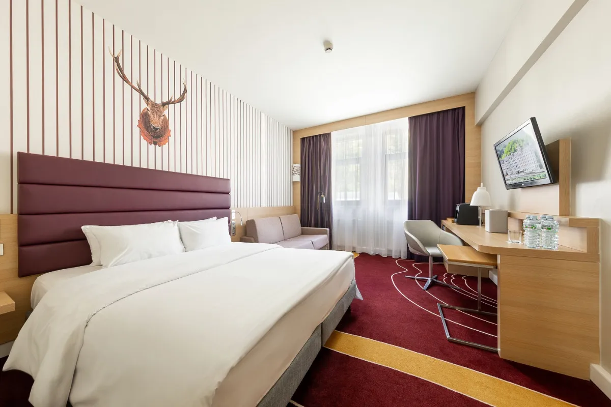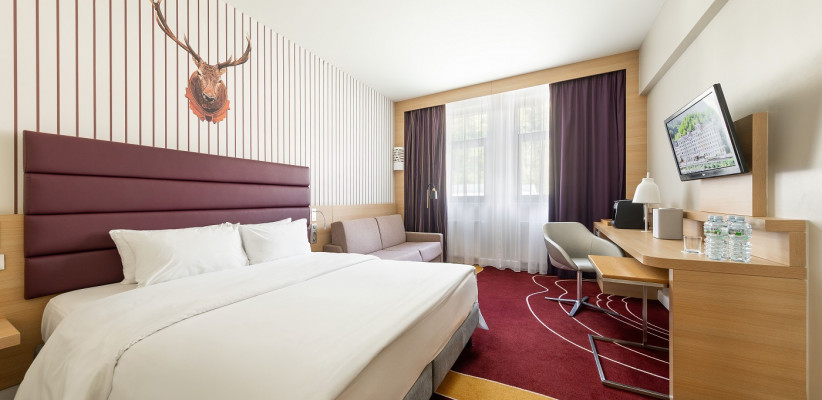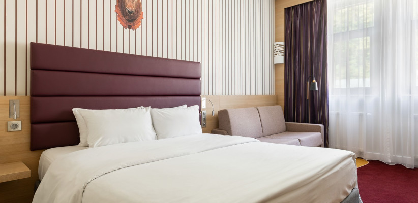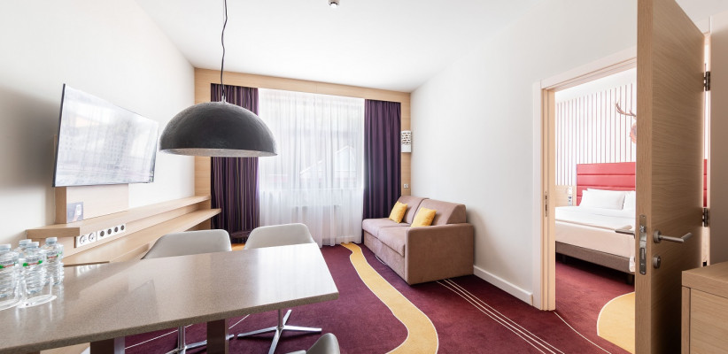 48 м2, просторный номер в тёплых тонах, вид на лес, спальня с одной двуспальной кроватью и обеденная зона с раскладывающейся софойЛюкс с видом на реку