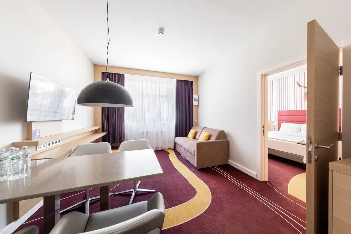 48 м2, просторный номер в тёплых тонах, вид на реку, спальня с одной двуспальной кроватью и обеденная зона с раскладывающейся софой