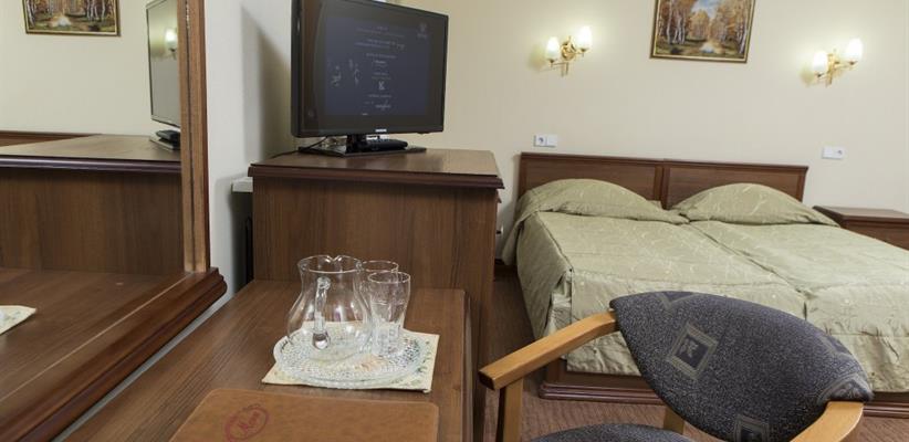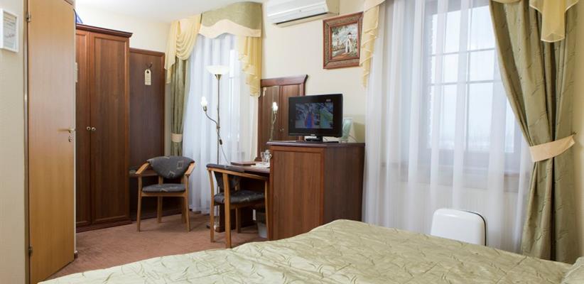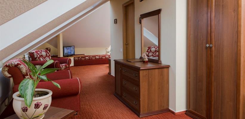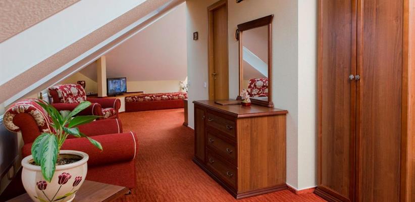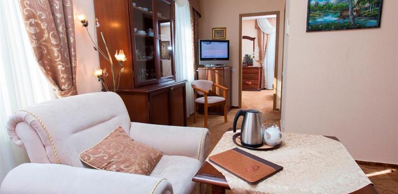 Люкс – площадь 35 кв. м, максимальное размещение 3 чел. Номер состоит из гостиной, оборудованной мягкой мебелью, а также спальной комнаты с двуспальной кроватью.