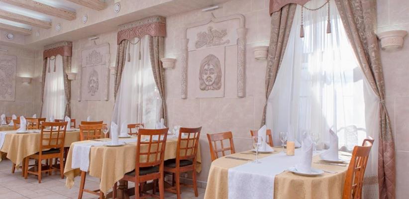 Концепция питания BB. На территории работает ресторан «Мономах», три зала в историческом стиле и летняя веранда на 50 посадочных мест. Доступно обслуживание номеров.