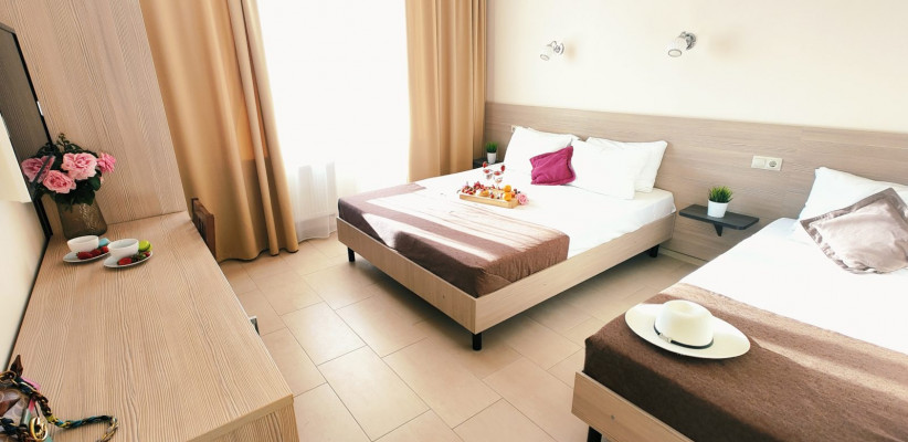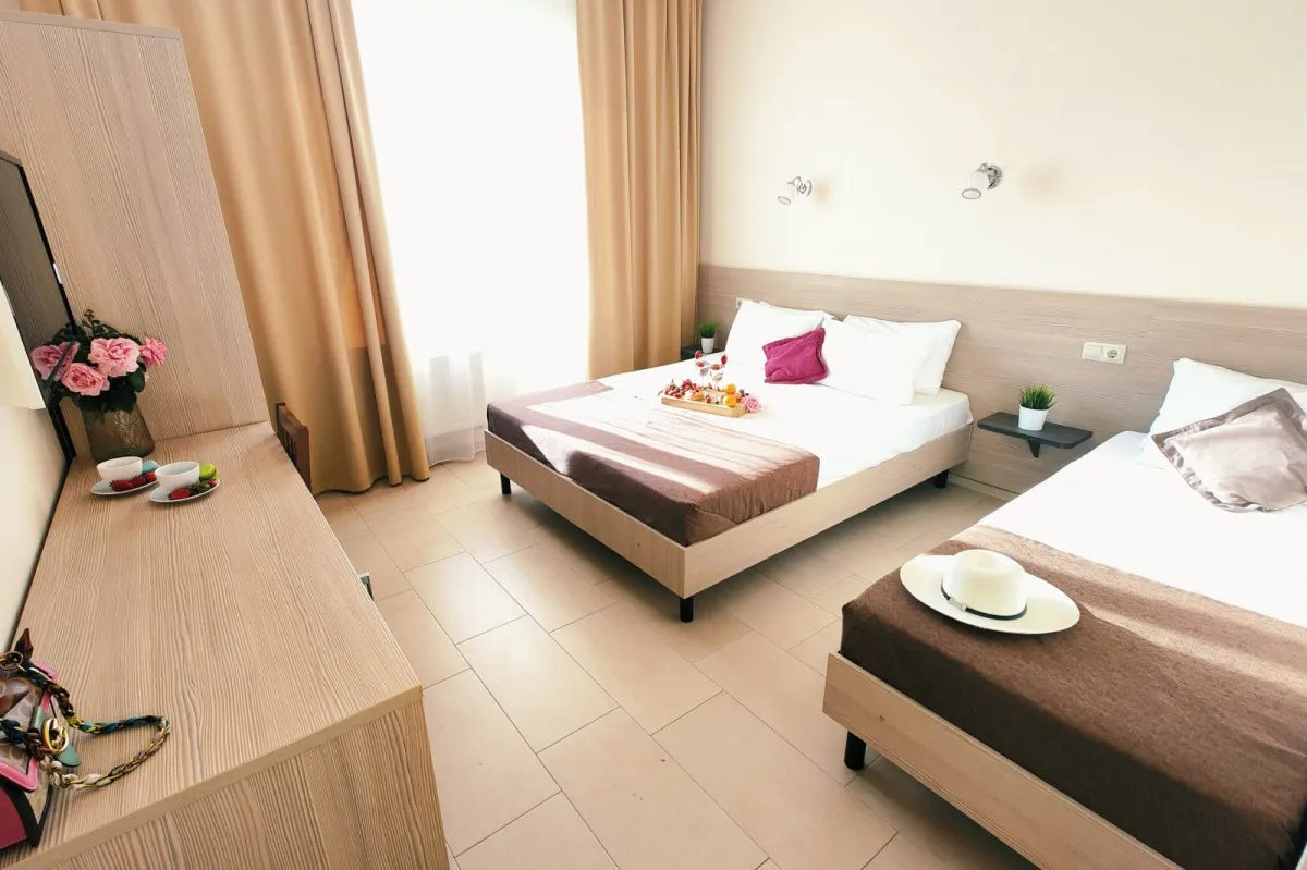 кровать двуспальная, количество гостей: 2Полулюкс трехместный (вид на море)
