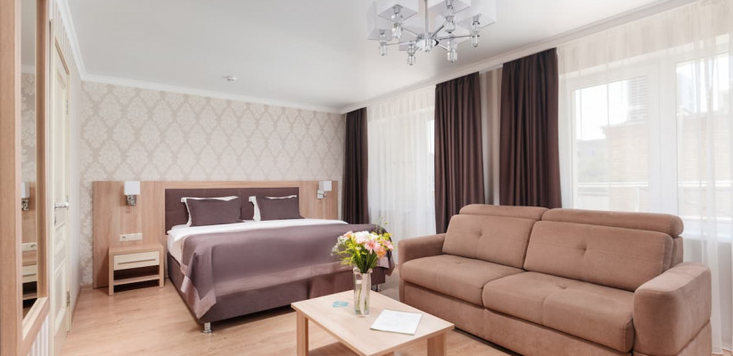 28-35 м2, двуспальная кровать или две односпальные кровати, гостиная зона с диваном-кроватью, балкон. Количество гостей: 4Люкс
