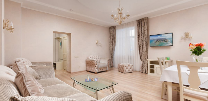 70 м2, две спальни, две двуспальные кровати, отдельная гостиная с диваном-кроватью, балкон. Количество гостей: 6