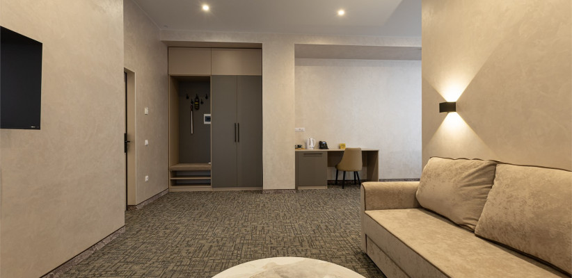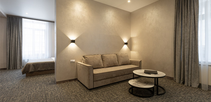 30 м2, двуспальная кровать размера «king-size», зона отдыха с диваном, вид на внутренний двор. Количество гостей: 4Люкс