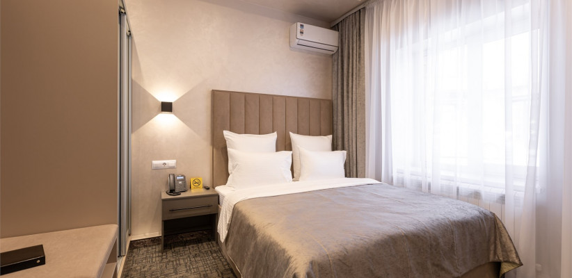 12 м2, двуспальная кровать размера «Queen-size», вид на внутренний двор. Количество гостей: 2Стандарт без окна