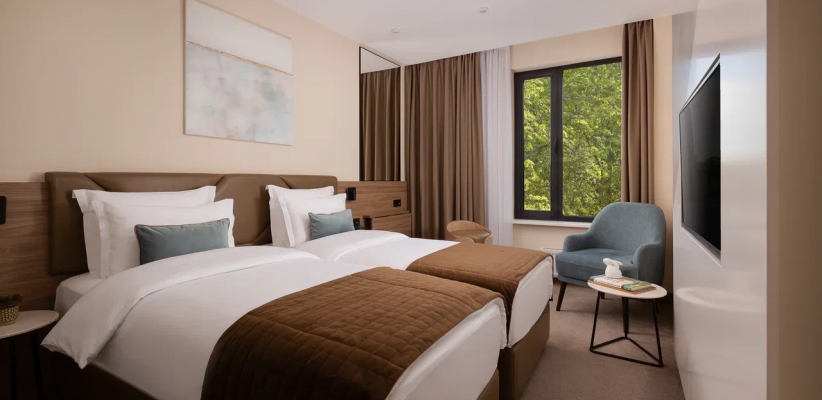 Концепция внутреннего декора отражает особенности паркового расположения отеля. В интерьере превалируют натуральные материалы, дневное освещение, оттенки и паттерны по природным мотивам.