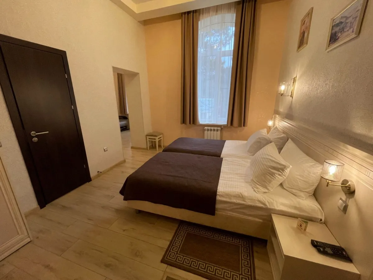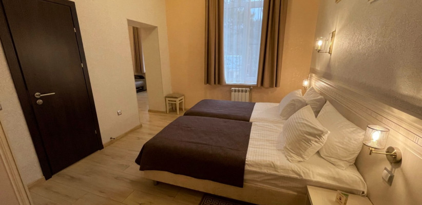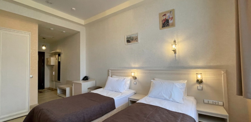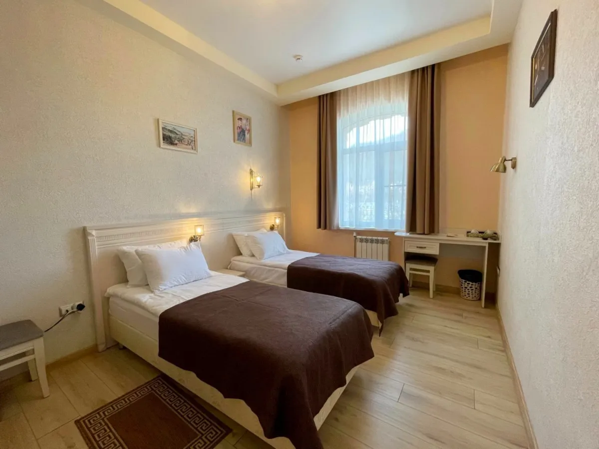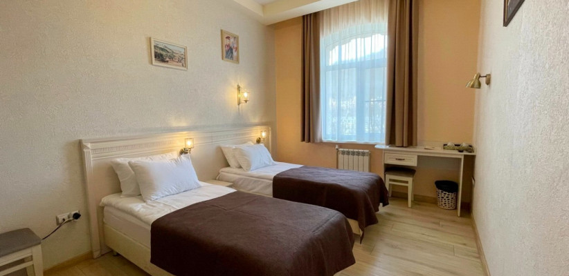 28 м2, две односпальные кровати, зона отдыха с диваном, вид на горы и сад. Количество гостей: до 3