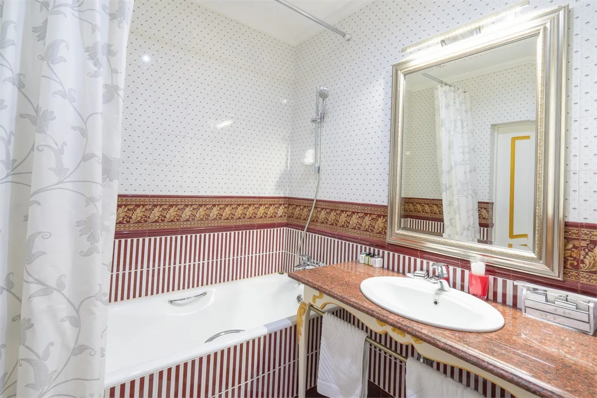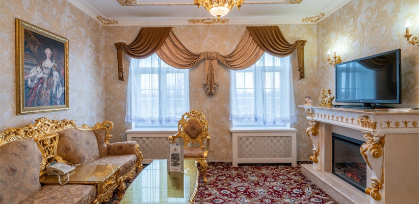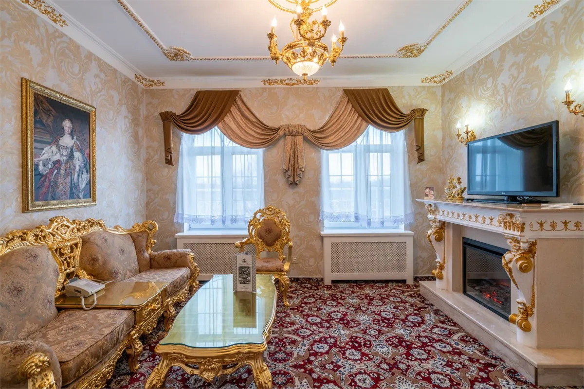 54 м2, двухкомнатный номер с видом на парковую зону, состоящий из спальни с двуспальной кроватью, просторной гостиной с камином. Количество гостей: 3Меньшиков (Петровский Причал)
