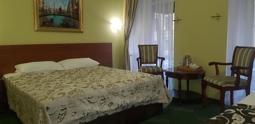 Люкс – номер площадью 18 кв. м, максимальное размещение 3 взрослых, в спальне две односпальные кровати или одна двуспальная. Также в номере есть балкон, холодильник.