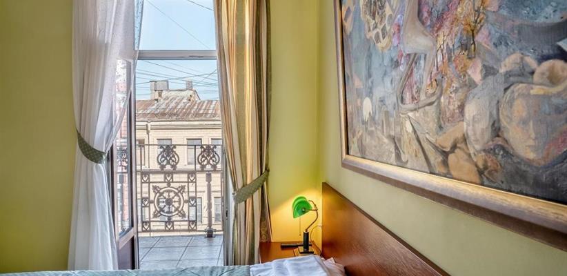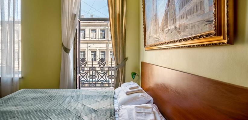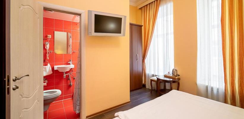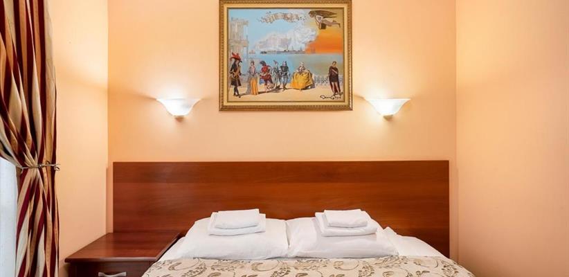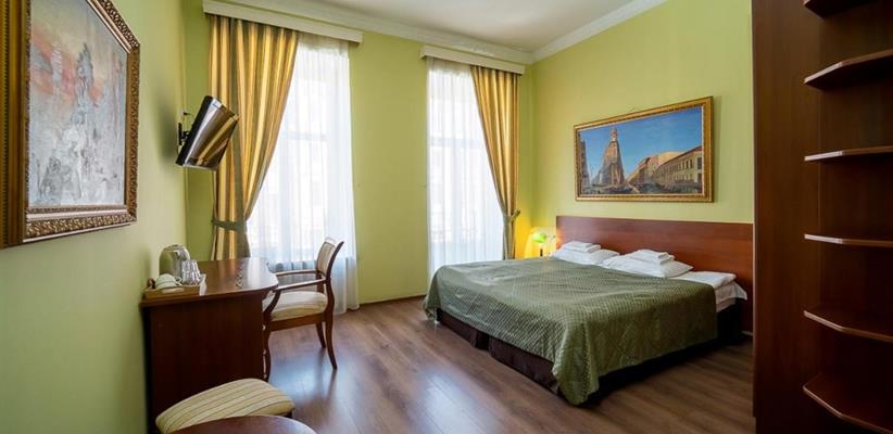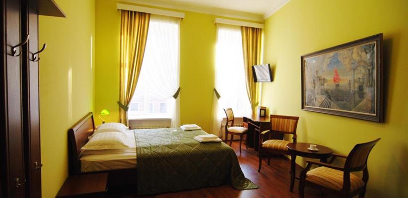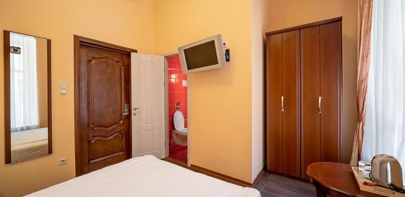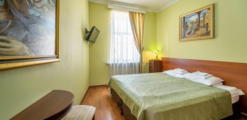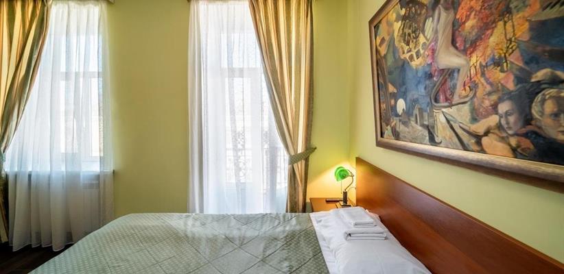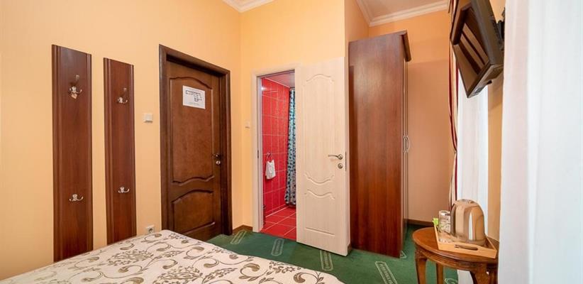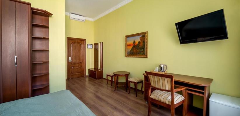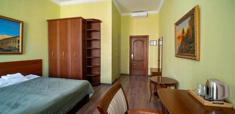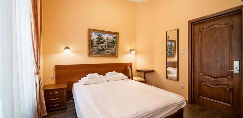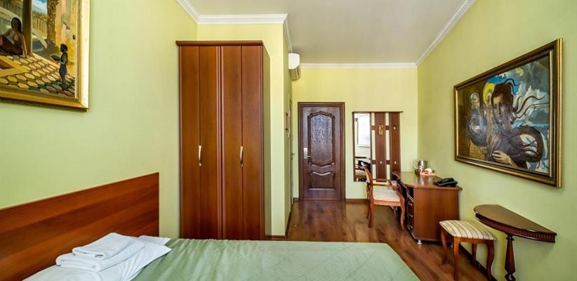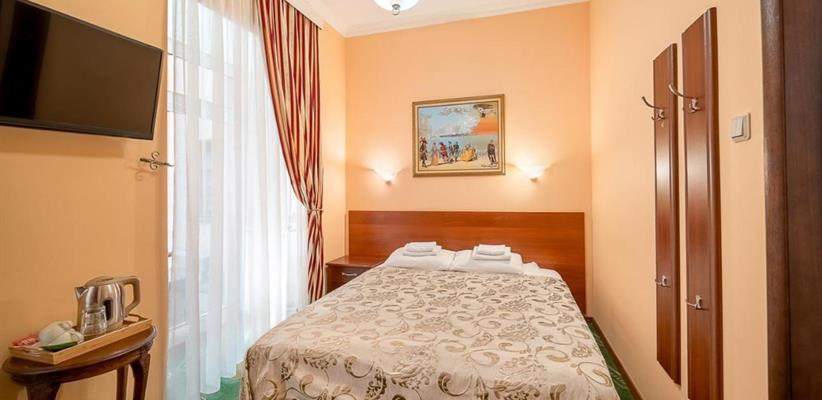 Небольшой стандартный номер – номер площадью 14 кв. м, максимальное размещение 2 взрослых, в спальне две односпальные кровати или одна двуспальная.