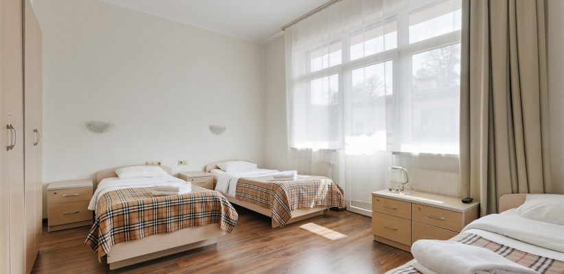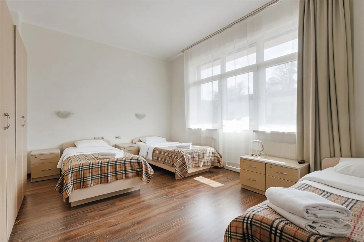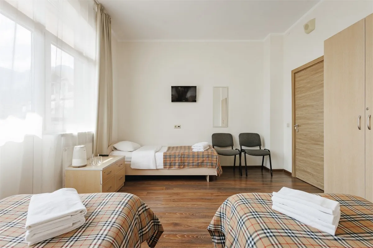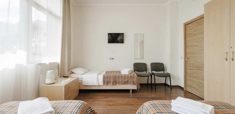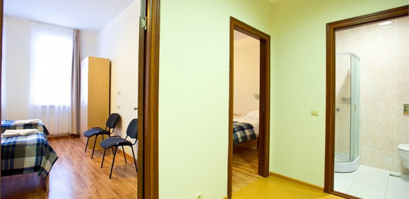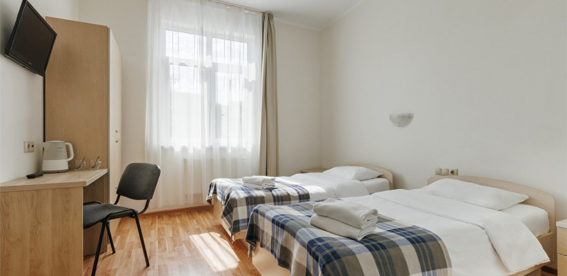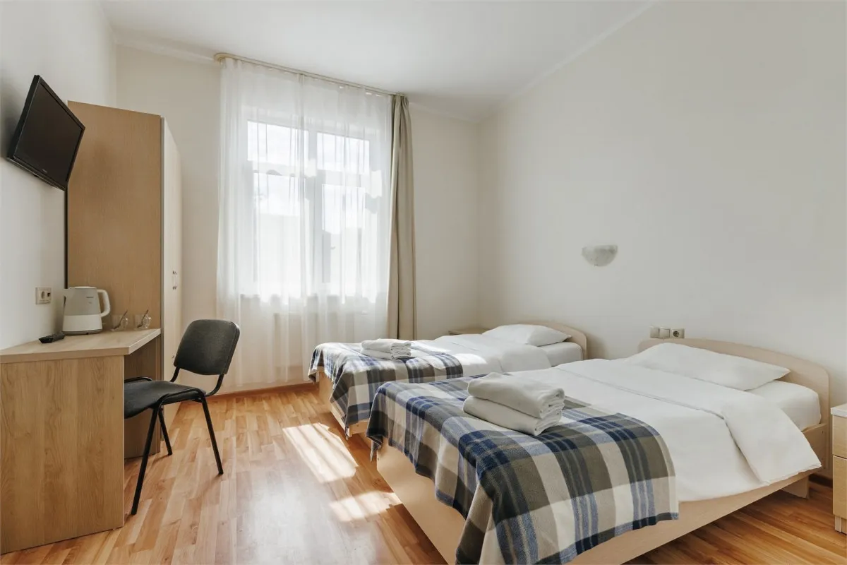 15 м2, расположен в двух-, трех- или четырехкомнатном блоке. Общая ванная комната и прихожая на два и три номера или две ванные комнаты и прихожая на четыре номера. Две односпальные кровати. Возможно поставить раскладушку для третьего гостя. Количество гостей: 3Трехместный номер в блоке с общим санузлом