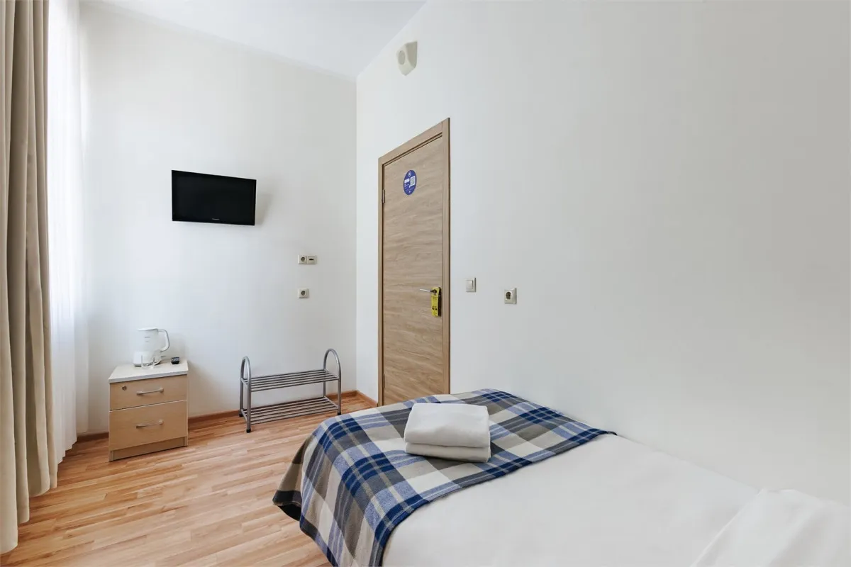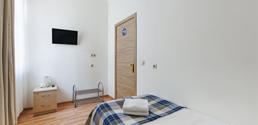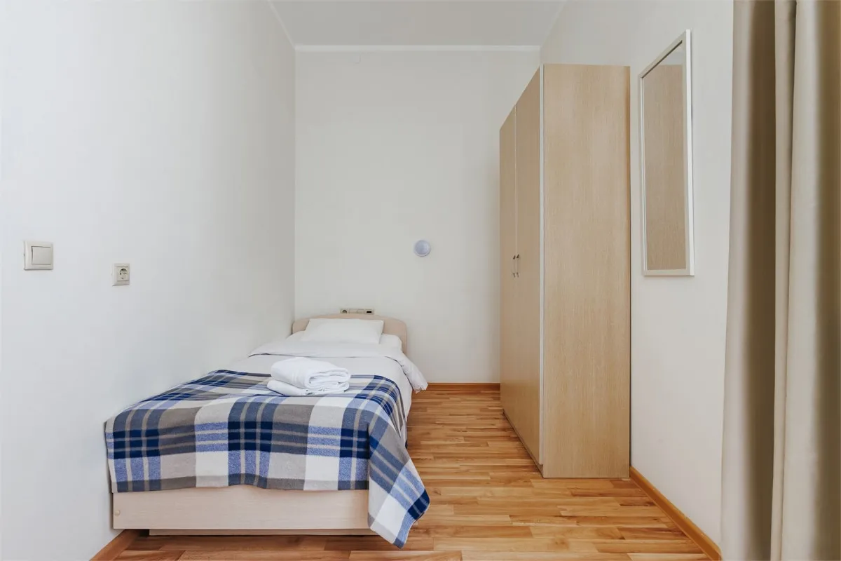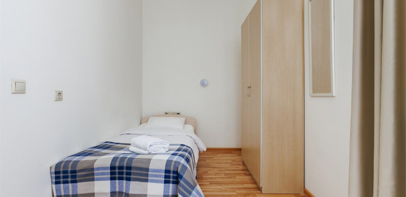 9 м2, расположен в трех- или четырехкомнатном блоке, односпальная кровать. Общая ванная комната и прихожая на три номера или две ванные комнаты и прихожая на четыре номера. Количество гостей: 1Небольшой двухместный номер в блоке с общим санузлом