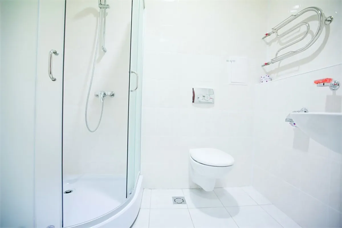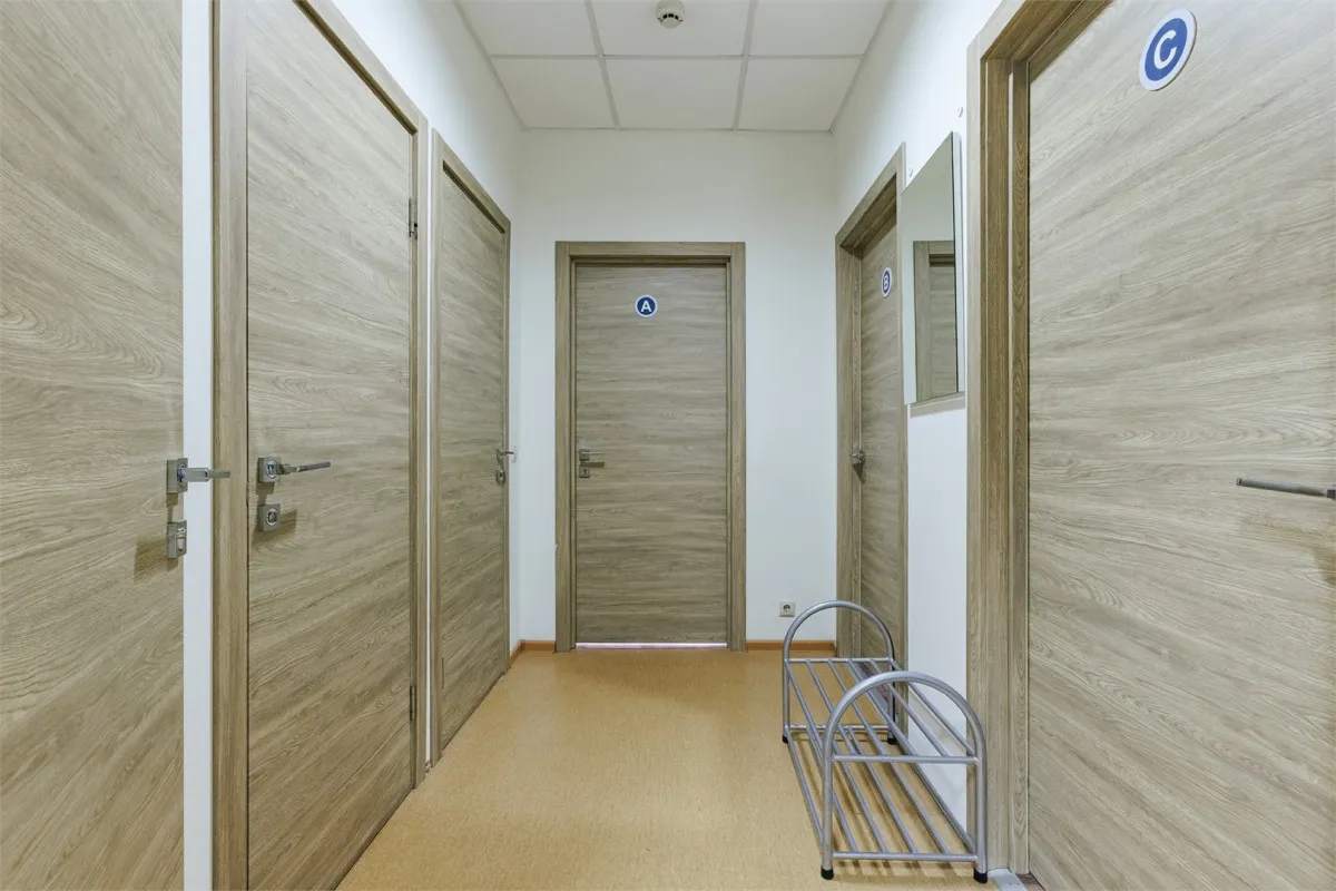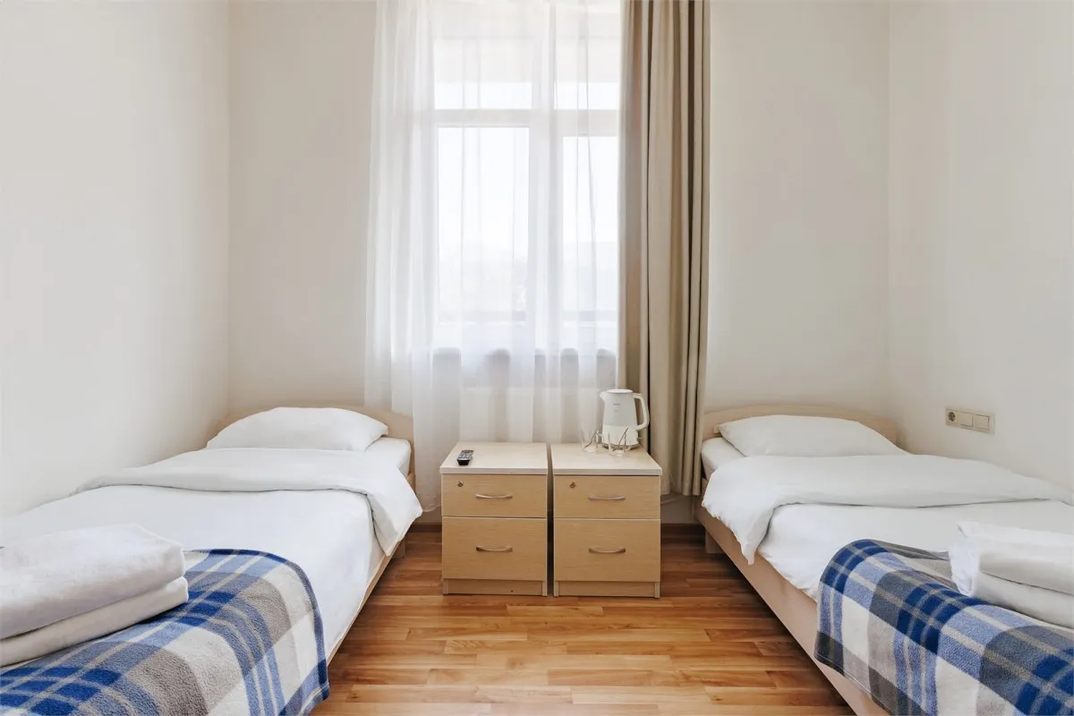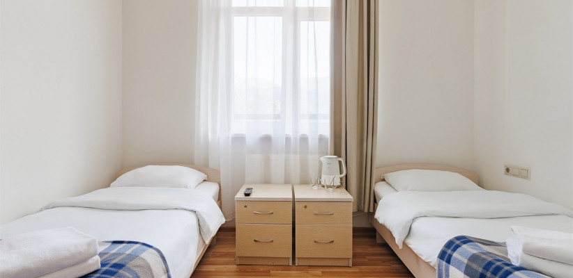 11 м2, расположен в трех- или четырехкомнатном блоке, имеет общий санузел с душем и прихожую. Общая ванная комната и прихожая на три номера или две ванные комнаты и прихожая на четыре номера. Две односпальные кровати. Количество гостей: 2Двухместный номер в блоке с общим санузлом