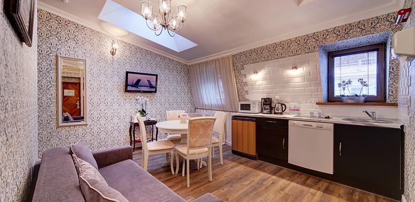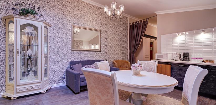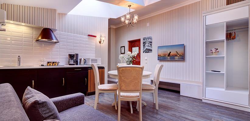 Семейный номер с одной спальней и гостиной – 43 кв. м, максимальное размещение 5 человек. В номере есть гостиная с диваном-кроватью, спальня с двумя односпальными или двуспальной кроватью, оборудованная кухонная зона со встроенной техникой и набором посуды.