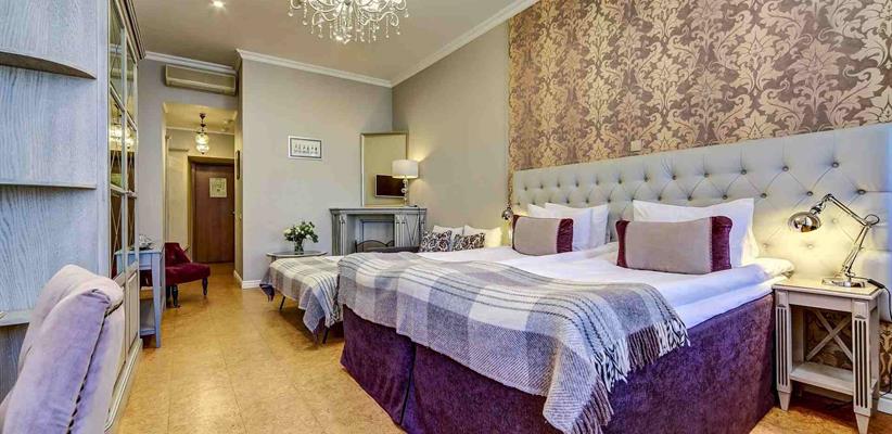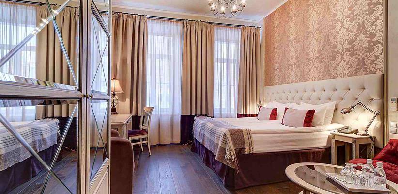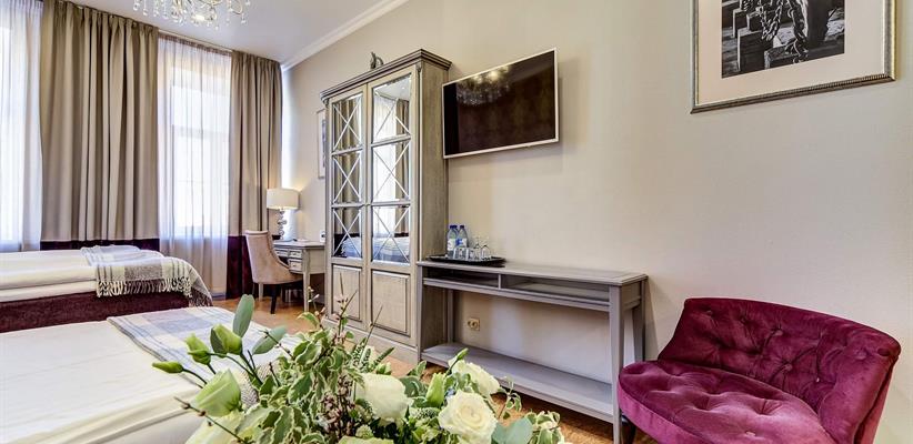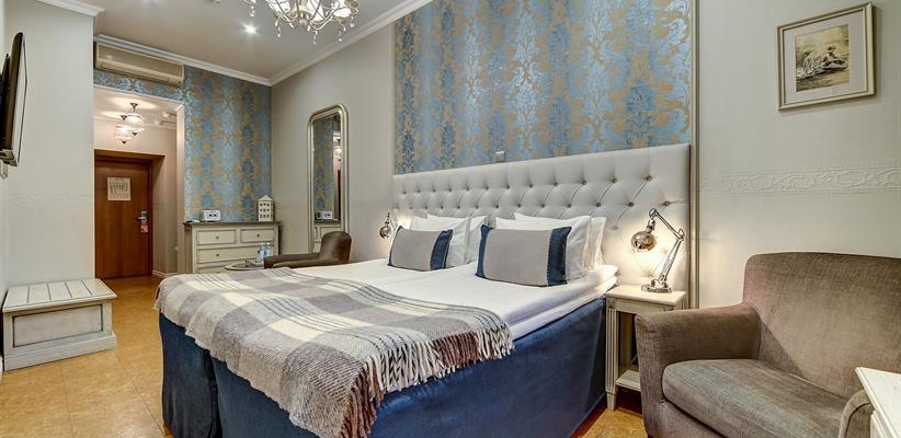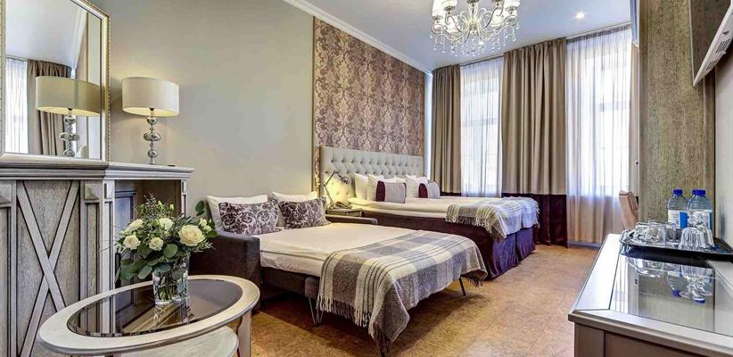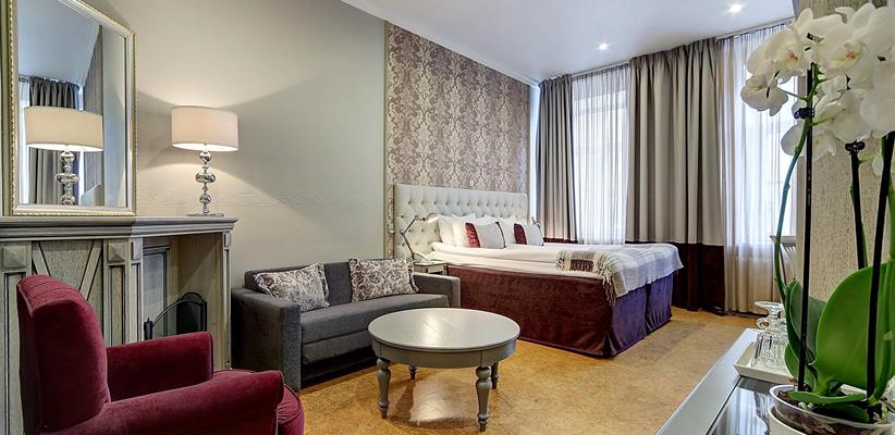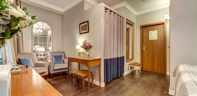Номер Комфорт Plus – 25 кв. м, максимальное размещение 4 человека. В номере есть выделенные зоны гостиной с раскладным диваном и спальни с двумя односпальными или двуспальной кроватью.