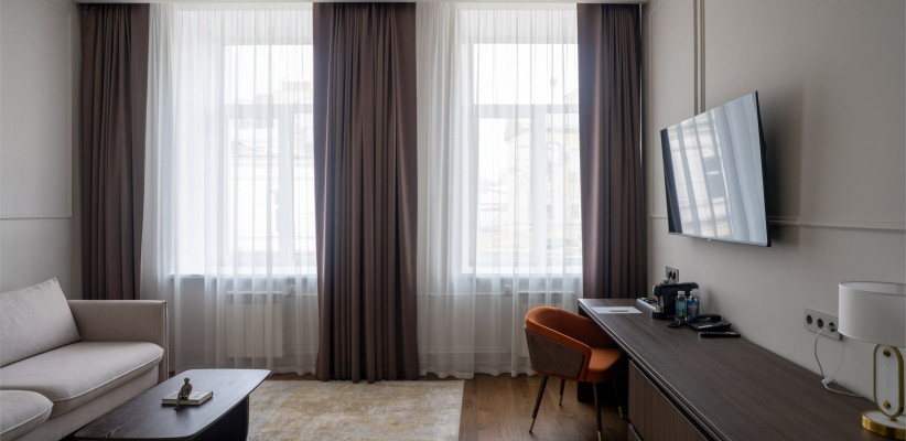 от 35 м2, окна выходят на историческую часть города либо на внутренний дворик. Двуспальная кровать или две односпальные. Количество гостей: 3Джуниор Сюит (Посольский Люкс с балконом)