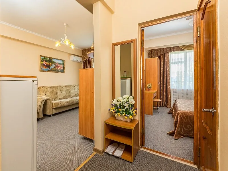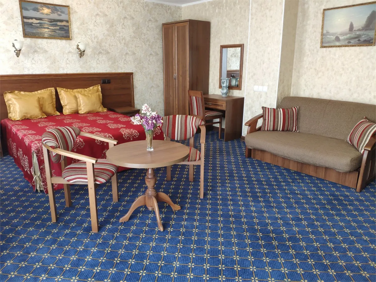 26 м2, двуспальная кровать или две односпальные кровати, отдельная гостиная с раскладным диваном, балкон. Количество гостей: 2+2Люкс с кухней