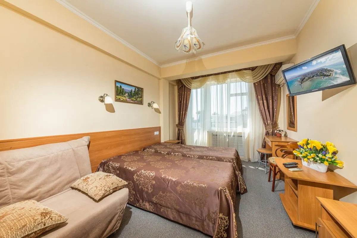 20 м2, двуспальная кровать или две односпальные кровати, раскладной диван, меблированный балкон. Количество гостей: 2+1Студия 3-местная