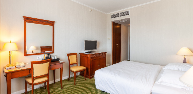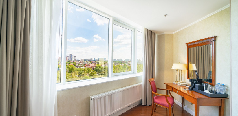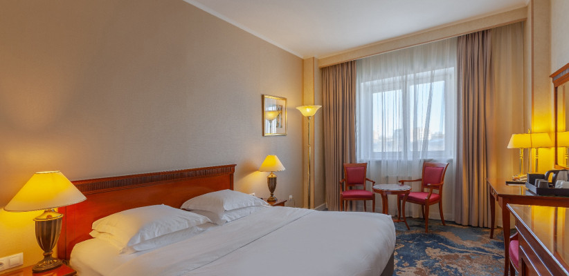 23 м2, с видом на город или Волгу; 1 спальня, две односпальные кровати, рабочая зона. Количество гостей: 2Улучшенный номер с кроватью King Size