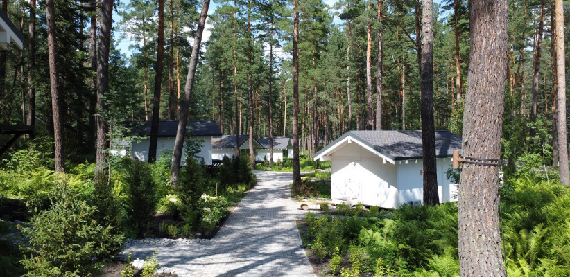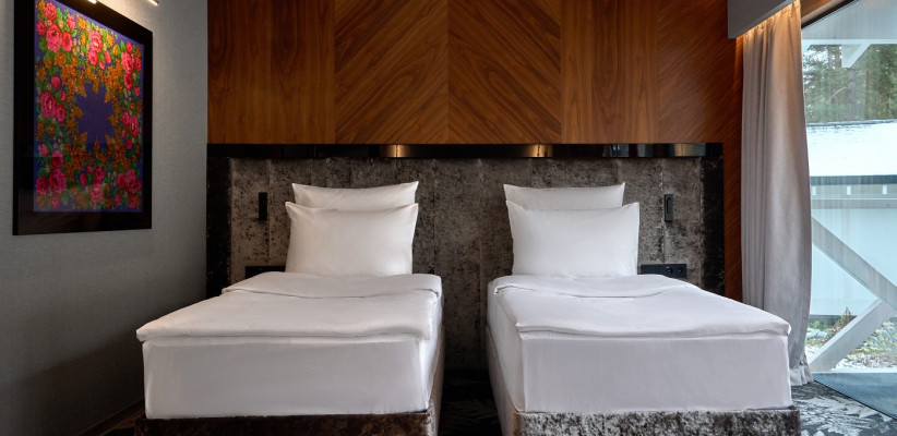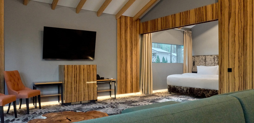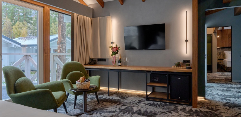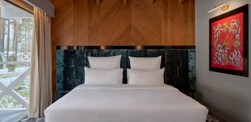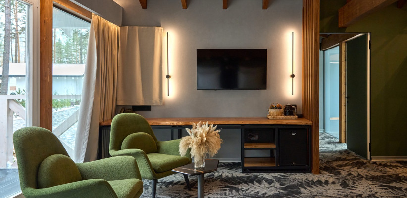 Для размещения гостей – 36 стильных шале категории люкс площадью от 38 до 62 м2, включая 12 шале с возможностью объединения для семейного отдыха. Все строения выполнены в современном эко-стиле, гармонично интегрированном в первозданную природу. В интерьерах – натуральное дерево, экологически чистые материалы, камень и панорамные окна с потрясающими видами.18 Шале