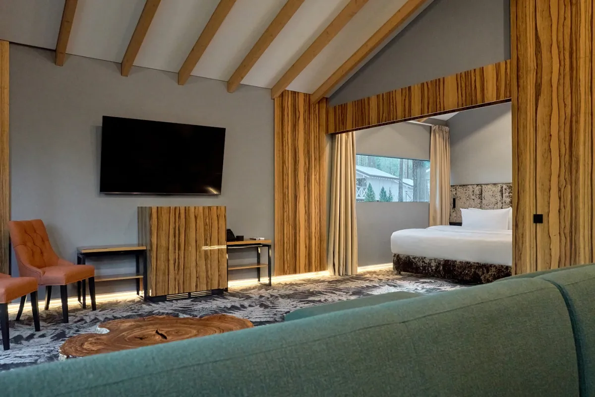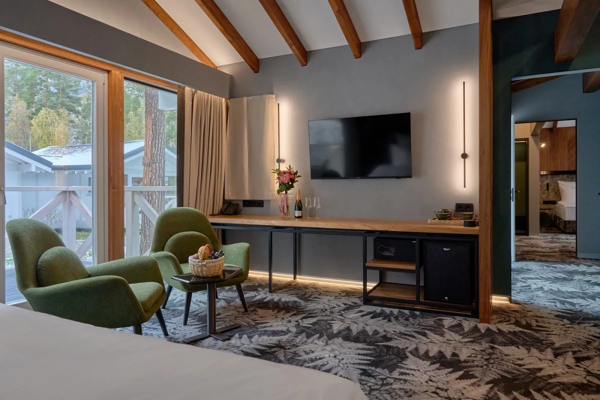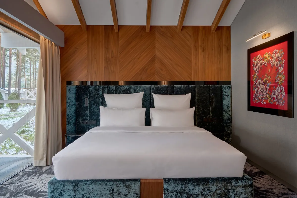Для размещения гостей – 36 стильных шале категории люкс площадью от 38 до 62 м2, включая 12 шале с возможностью объединения для семейного отдыха. Все строения выполнены в современном эко-стиле, гармонично интегрированном в первозданную природу. В интерьерах – натуральное дерево, экологически чистые материалы, камень и панорамные окна с потрясающими видами.18 Шале