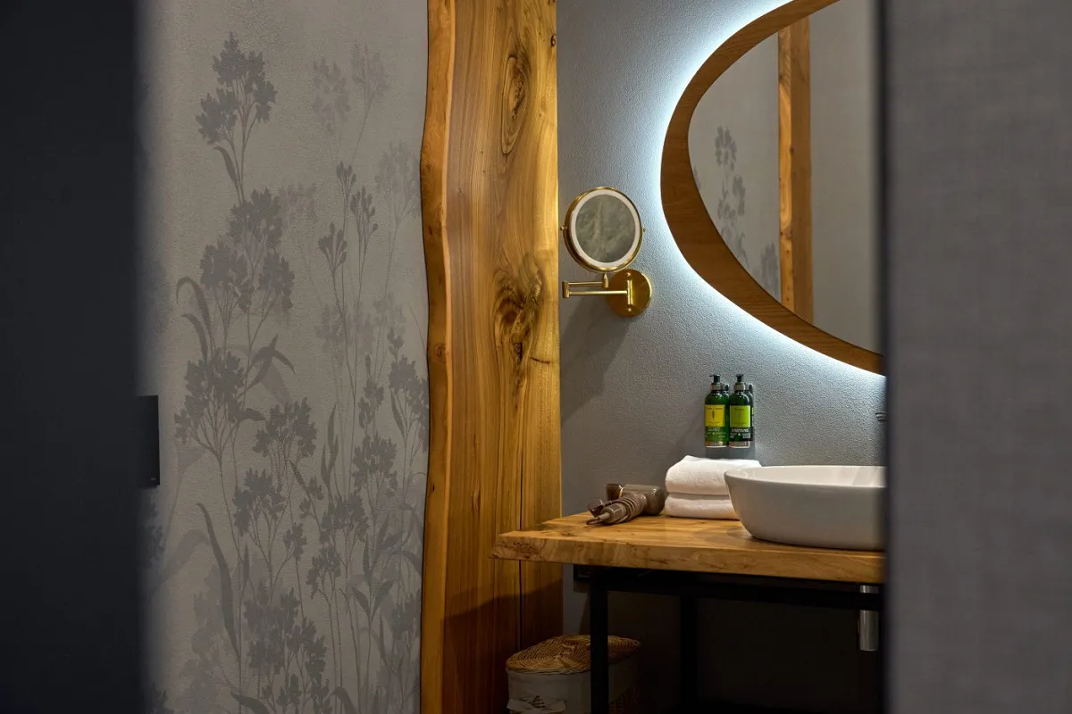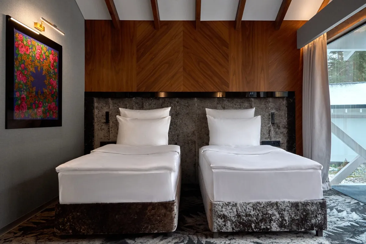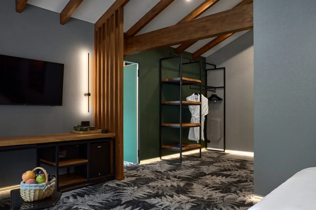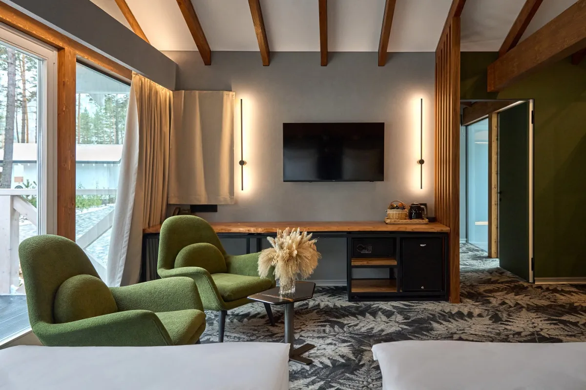 Для размещения гостей – 36 стильных шале категории люкс площадью от 38 до 62 м2, включая 12 шале с возможностью объединения для семейного отдыха. Все строения выполнены в современном эко-стиле, гармонично интегрированном в первозданную природу. В интерьерах – натуральное дерево, экологически чистые материалы, камень и панорамные окна с потрясающими видами.18 Шале