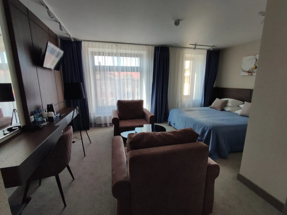 35 м2, двуспальная кровать или две односпальные кровати, гостиная зона с диваном, вид на город. Количество гостей: 4Люкс