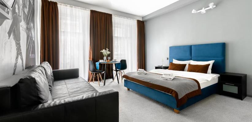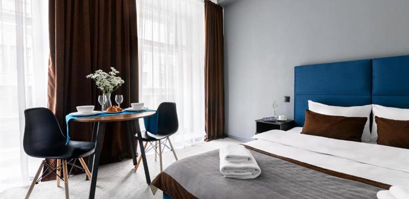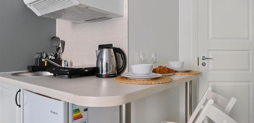 Стандартные апартаменты – 13 кв. м, максимальное размещение 2 человека. В номере есть холодильник, чайник, кондиционер.