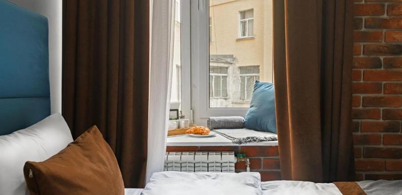 Комфорт – 15 кв. м, максимальное размещение 2 человека. В номере есть двуспальный диван-кровать, кухня с чайником, холодильником, микроволновой печью, мультиваркой.