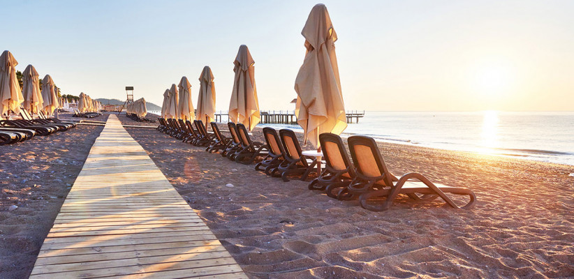 Собственный, песчаный, в 600 м. Территория закрытая и имеет собственную систему охраны. Вход осуществляется по браслетам гостя. Оборудован зоной лежаков под навесами, туалетами, душевыми, раздевалками. Работает спасательный и медицинский посты.