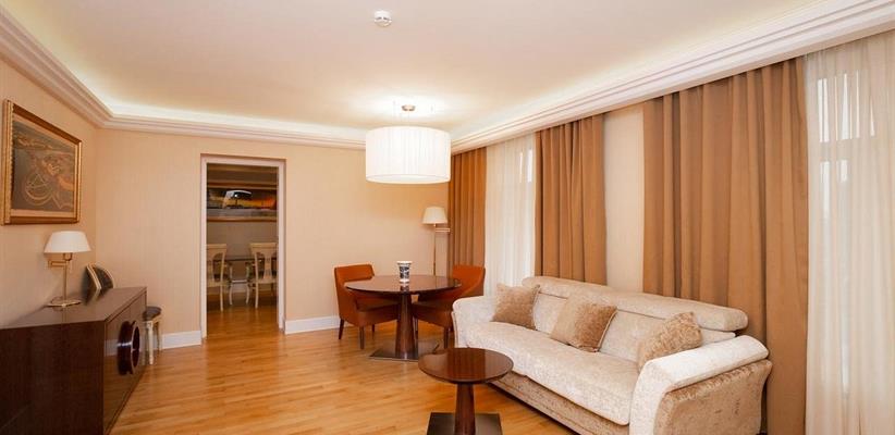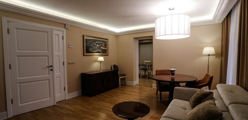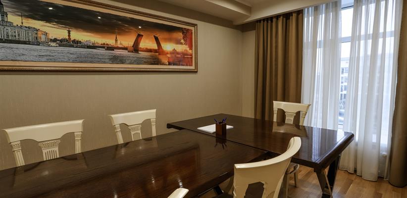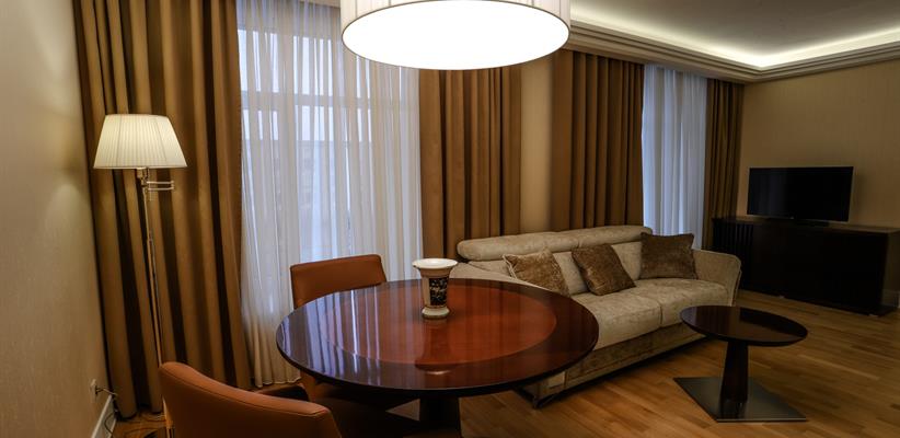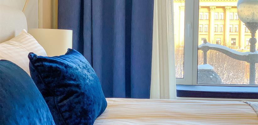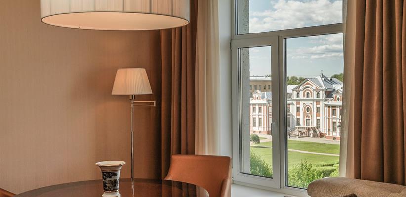 Представительский люкс. Площадь – 88 кв. м. В номере гостиная с диваном, кабинет, спальня с двуспальной кроватью. Рассчитан максимум на 3 человек. Вид на улицу Шпалерную (Кикина палаты).