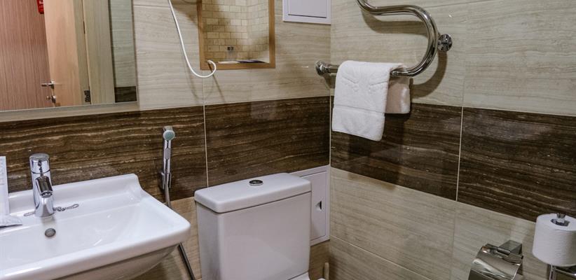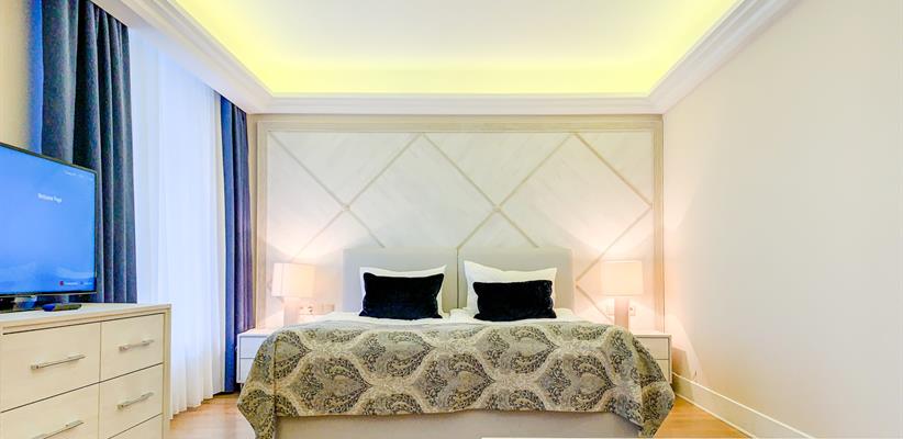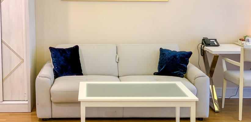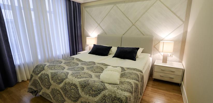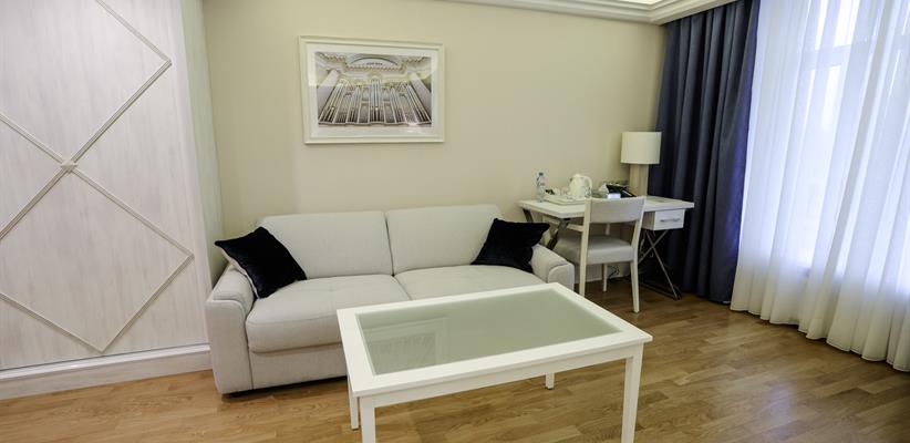 Люкс. Площадь – 34 кв. м. В номере двуспальная кровать и диван-кровать. Рассчитан на 2-3 человека.