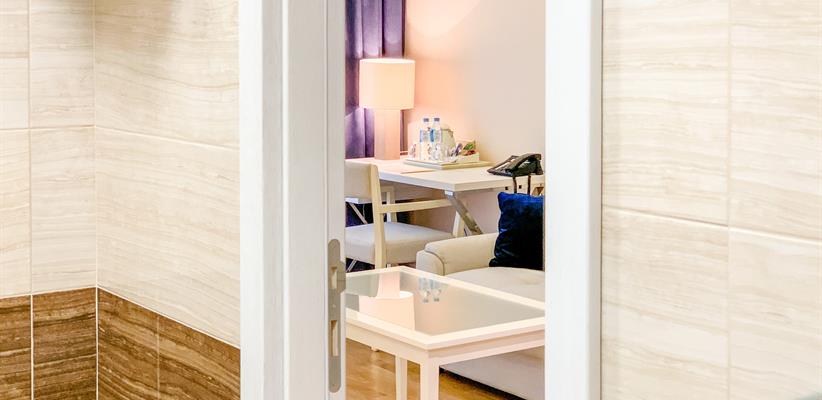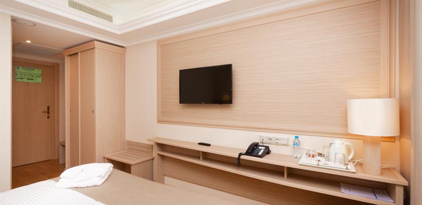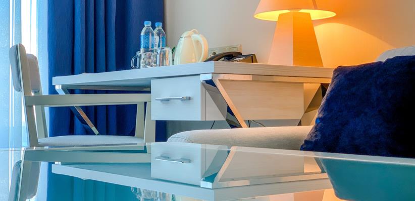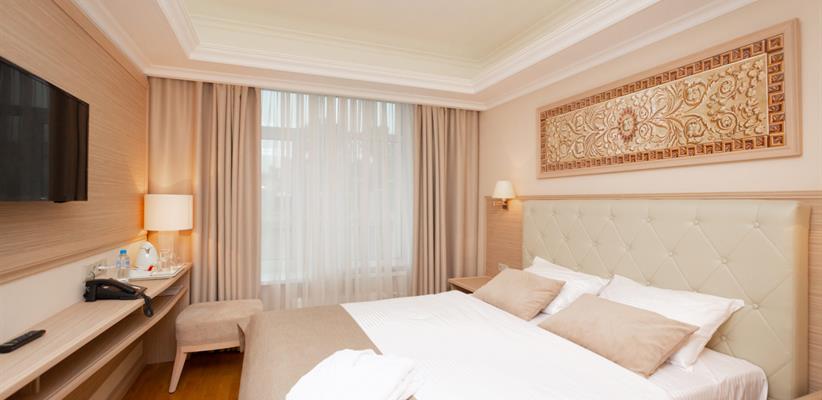 Полулюкс. Площадь – 14 кв. м. В номере двуспальная кровать и диван-кровать. Рассчитан на 2-3 человек. Вид на город.