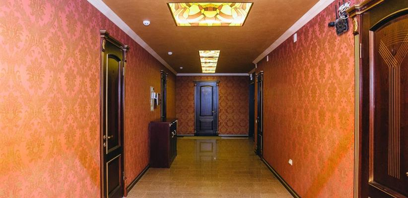 Трехкомнатный номер – максимальное размещение 6 человек, двуспальная кровать, вид из окон – во двор, на стадион. Мебель – барная стойка, вешалки, диван, журнальный столик, мягкая мебель, шкаф для одежды.