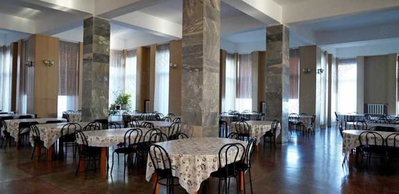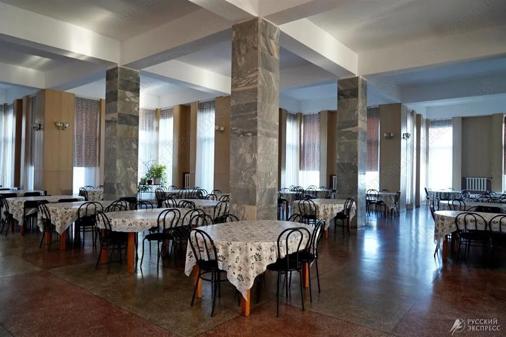 4-разовое общее сбалансированное питание в столовой санатория, возможен заказ диетического питания. Обеденный зал оригинальной конструкции, площадью 600 кв. м, с отделкой из мрамора. Вид на море.