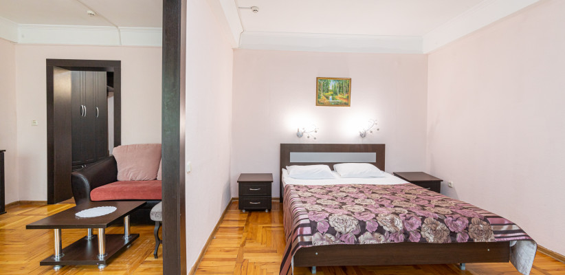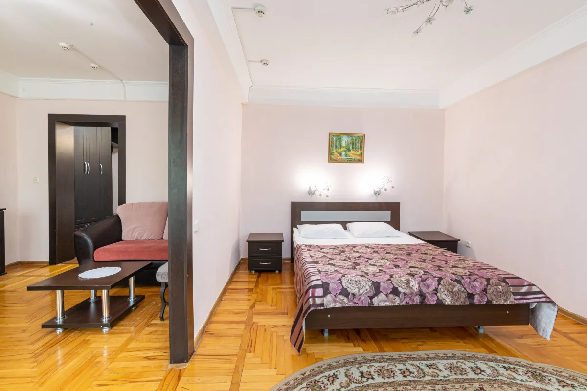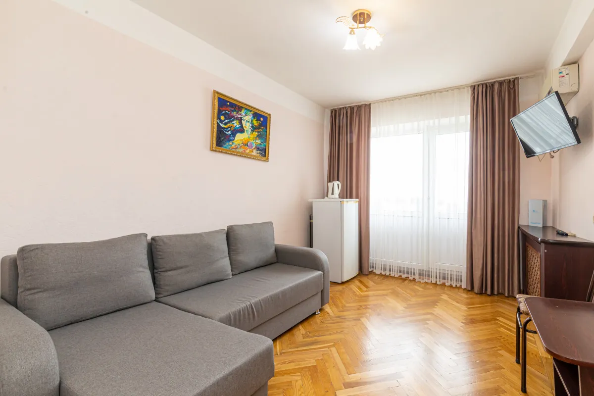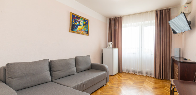 17 м2, с видом на город/ горы. В номере одна большая двуспальная кровать или две односпальные кровати. Дополнительные места: раскладная кроватьДвухместный двухкомнатный номер 1 категории стандарт (1К2м2к1)