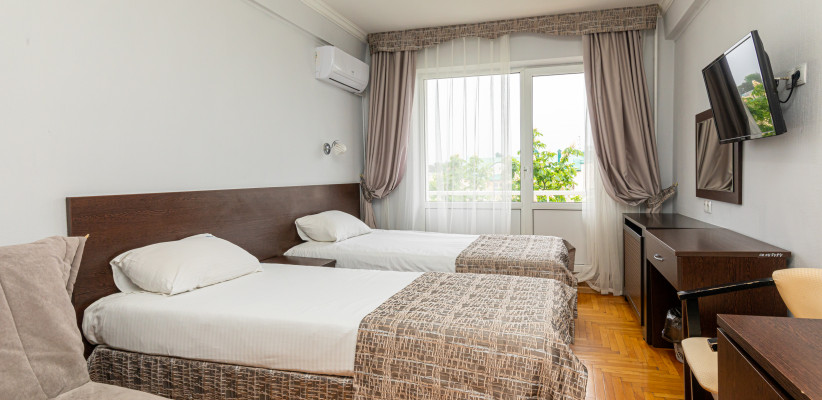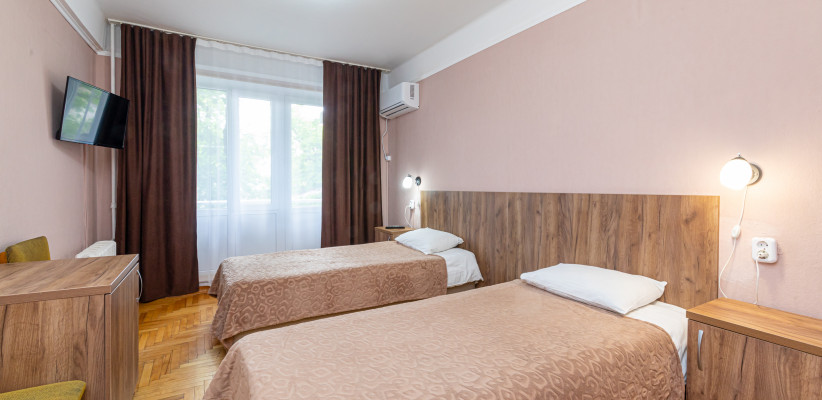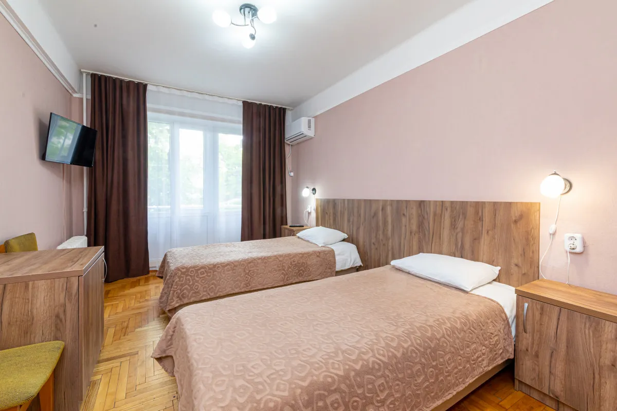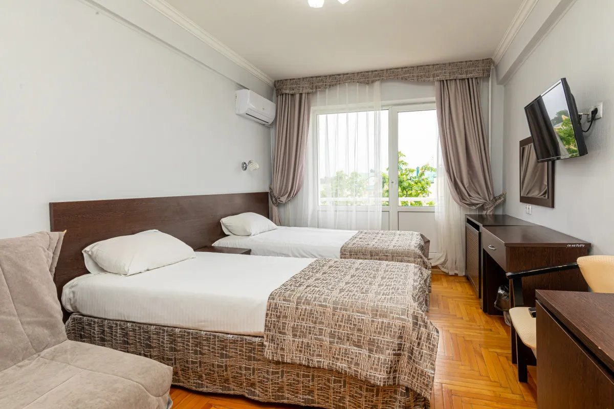 17 м2, с видом на город/ горы. В номере две односпальные кровати. Дополнительные места: раскладная кроватьДвухместный номер 2 категории стандарт (2К2м1к1)