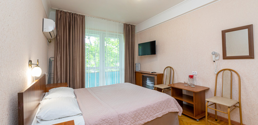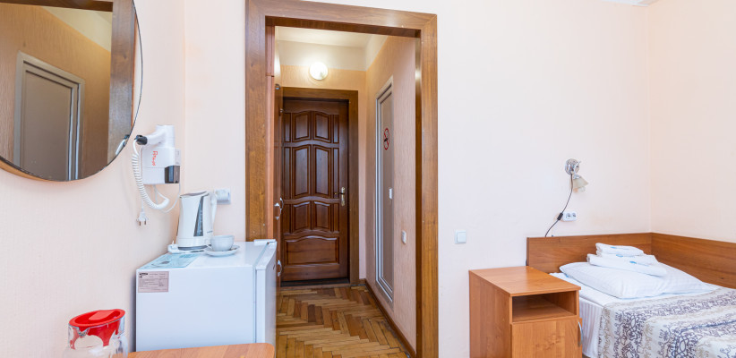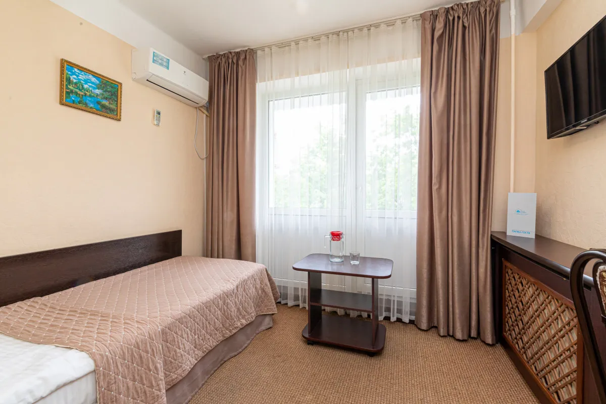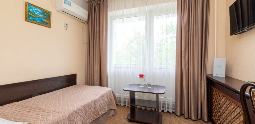 15 м2, с видом на город/ горы. В номере одна односпальная кровать, балкон. Дополнительные места: раскладная кроватьОдноместный номер 1 категории (1К1м1к1)