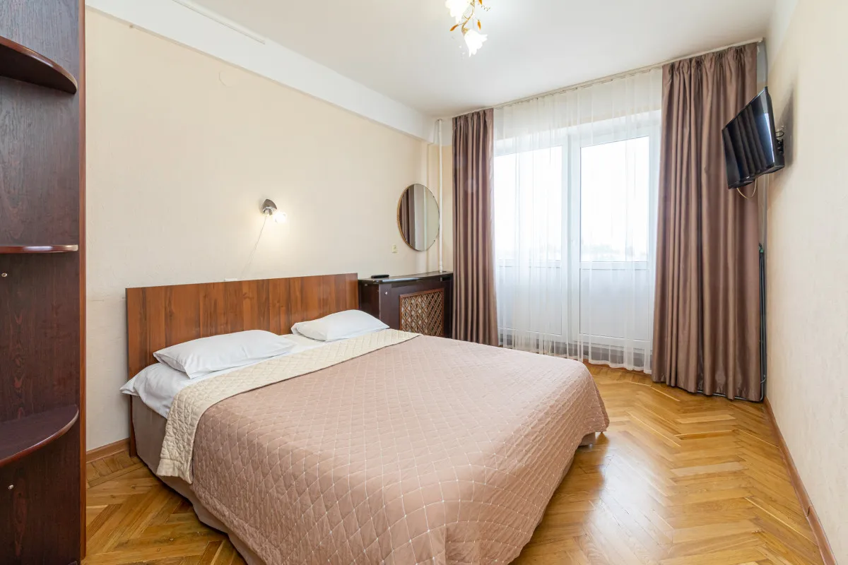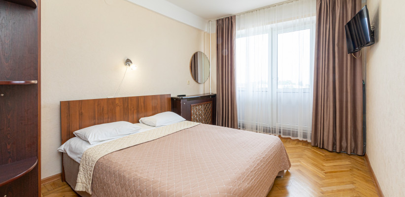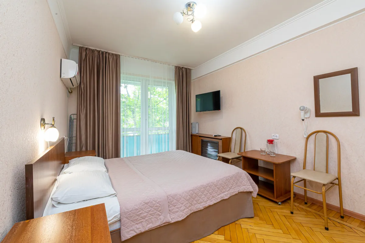 17 м2, с видом на город/ горы. В номере одна полутороспальная кровать, балкон. Дополнительные места: раскладная кроватьДвухместный номер 3 категории стандарт (3К2м1к1)