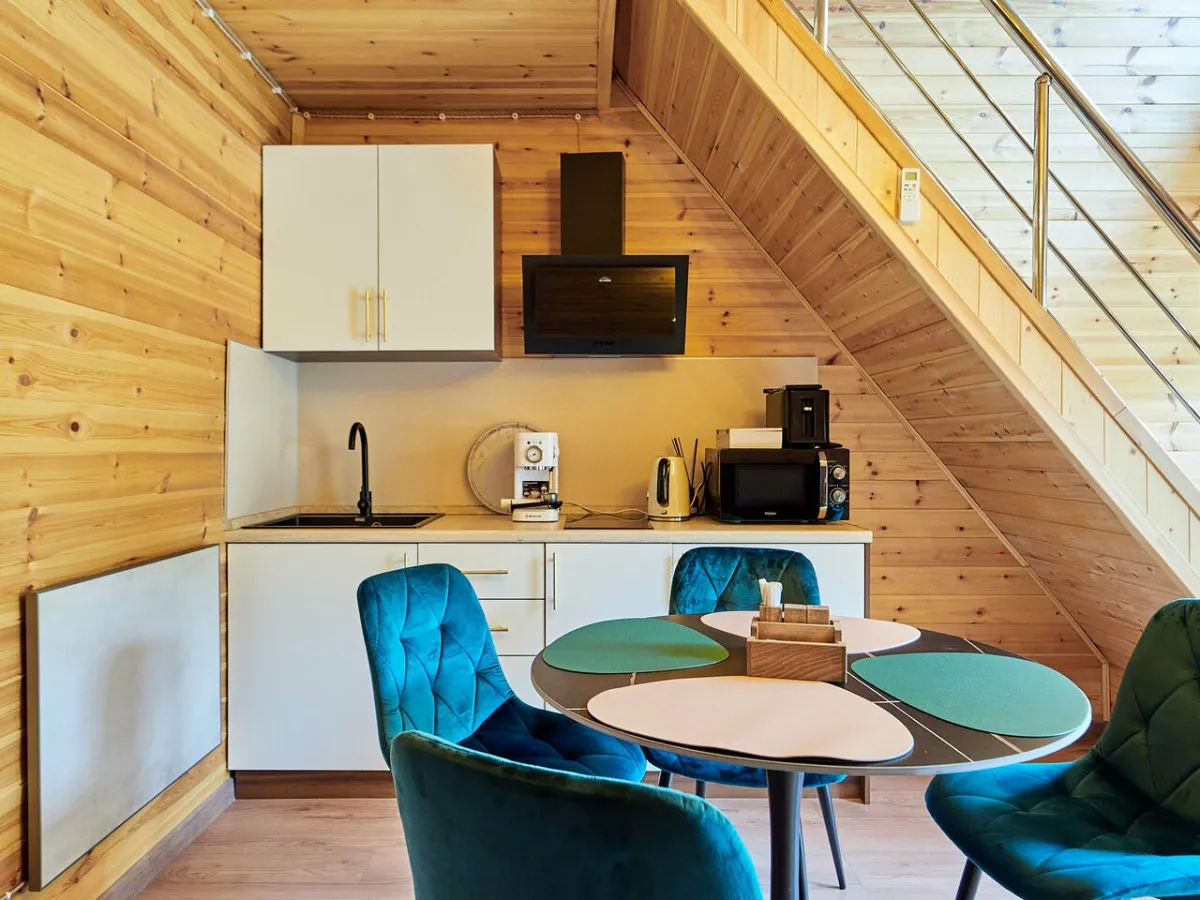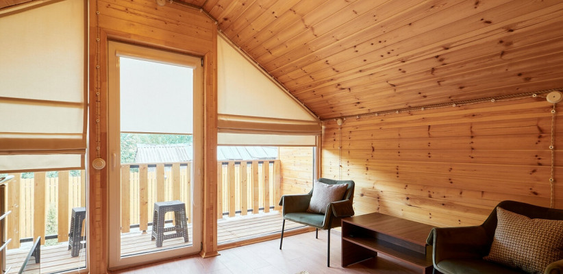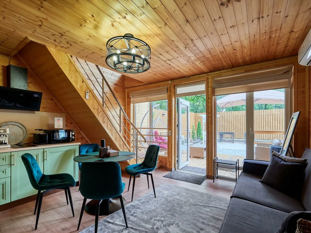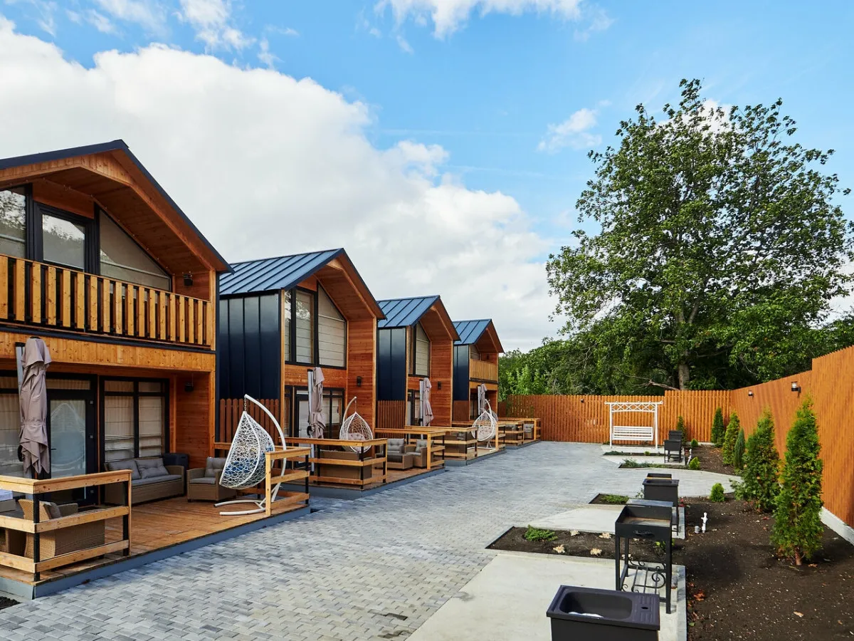 Гости размещаются в отдельных коттеджах с собственной террасой, что создает ощущение приватности и комфорта. На территории предусмотрен закрытый двор с зонами отдыха на свежем воздухе, что делает размещение особенно удобным для спокойного и семейного отдыха.